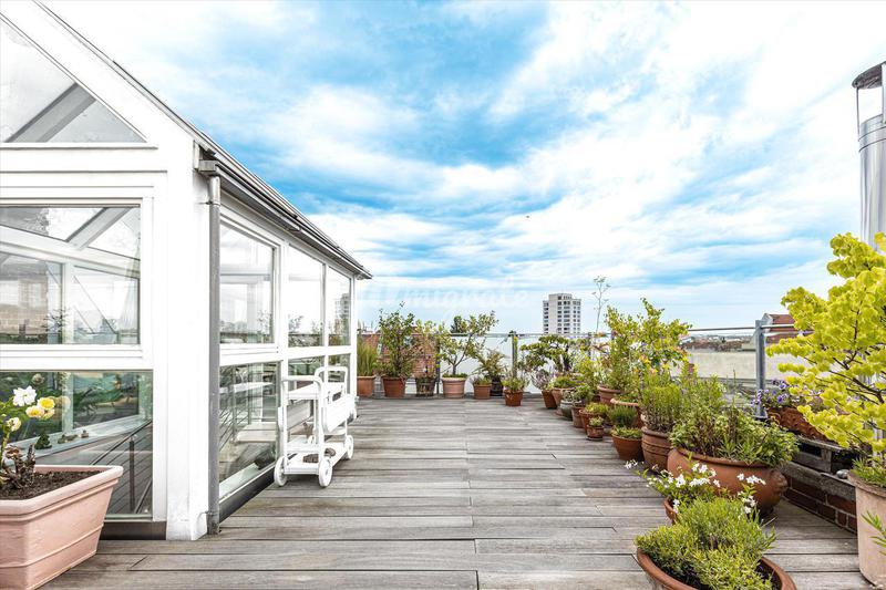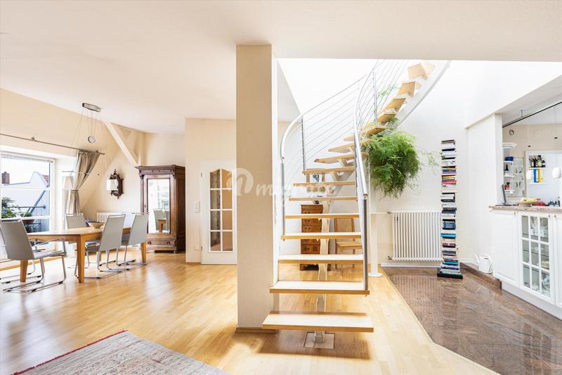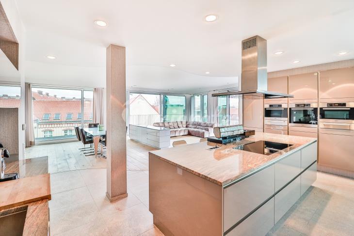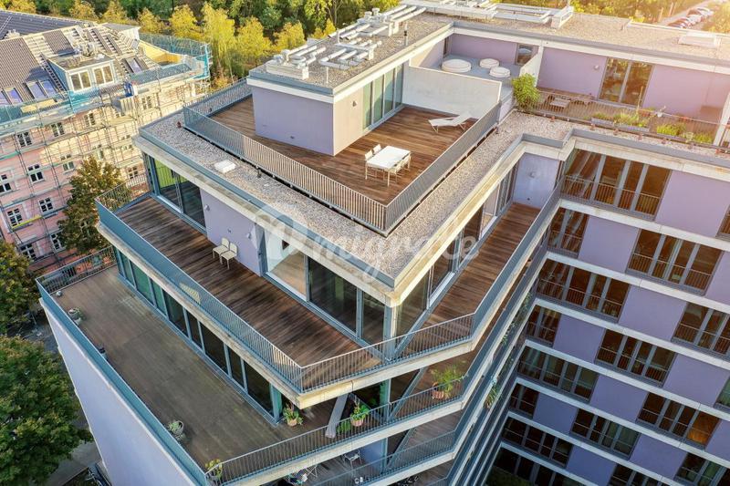 Пентхаус расположен в центре Берлина на 7-ом этаже жилого здания. Пентхаус площадью 188,25 кв. м включает террасу на крыше площадью 150 кв. м, гостиную с панорамными окнами, полностью оснащенную кухню