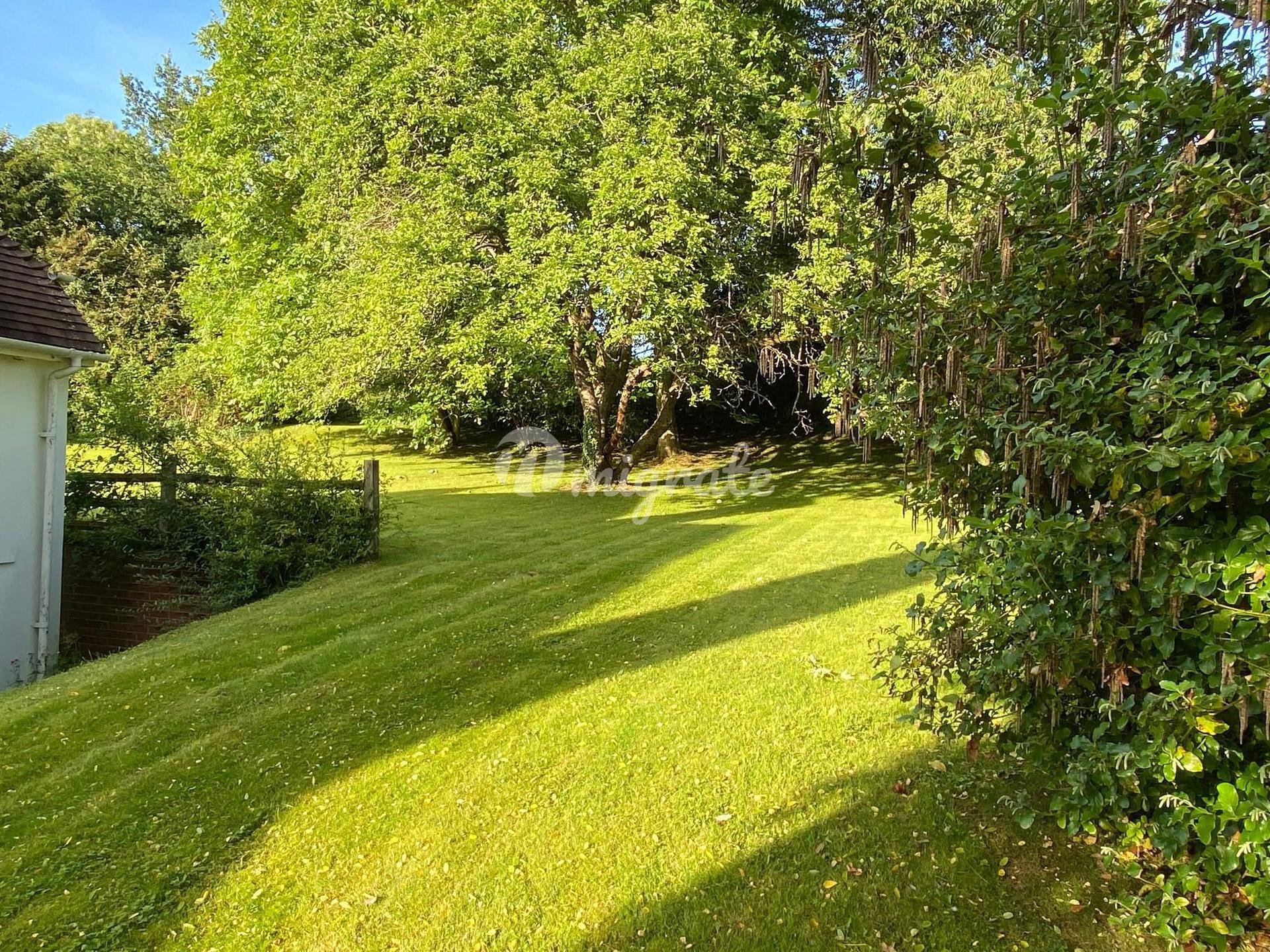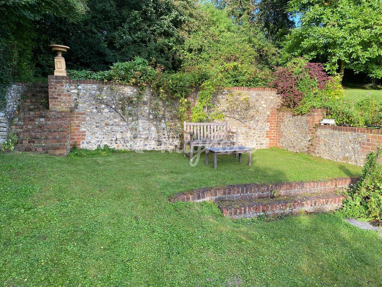Красивый сад частично огорожен стеной и в основном состоит из лужайки с множеством взрослых деревьев и кустарников.