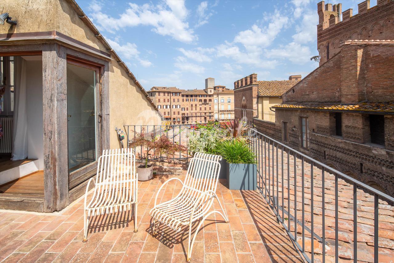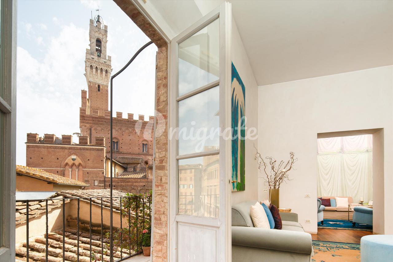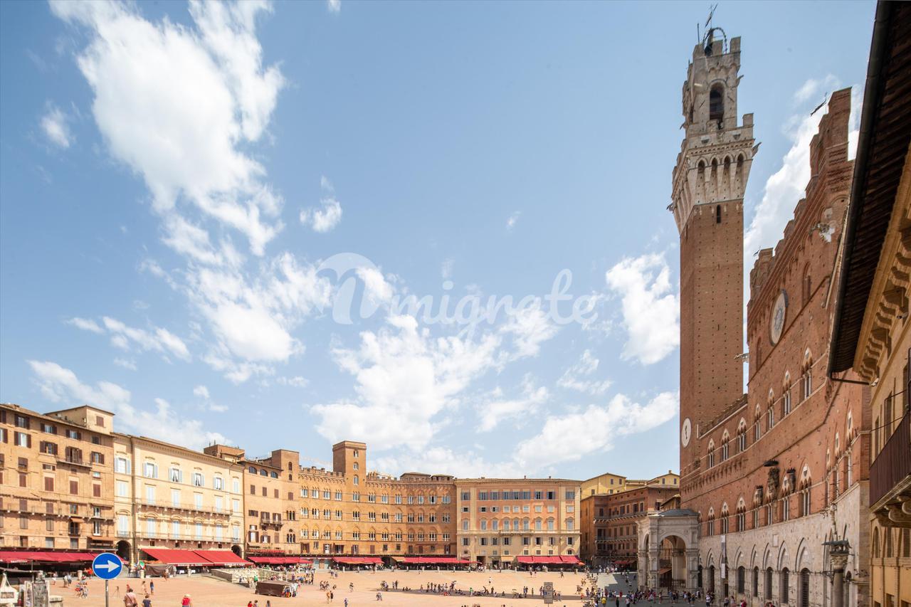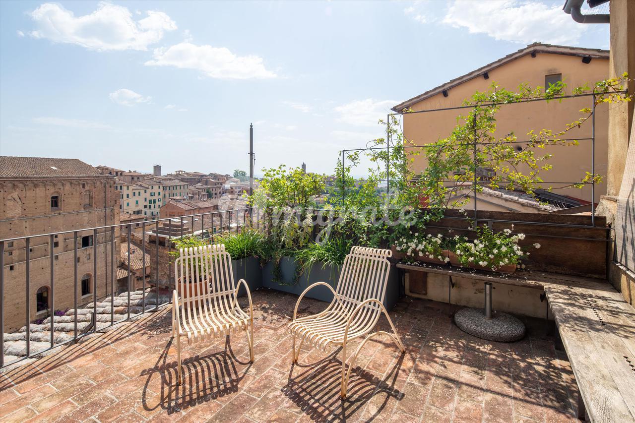 Квартира на втором этаже в элегантном палаццо недалеко от площади Пьяцца дель Кампо. Просторные и светлые апартаменты расположены на двух этажах с большой панорамной террасой и балконом, с которых открывается вид на красивые крыши Сиены, площадь и окружающие холмы к югу от города. Квартира была отреставрирована нынешними владельцами с паркетными полами из орехового дерева и мраморными ванными комнатами. От входной двери большой холл с главной спальней: спальня, гардеробная и ванная комната с двойной мраморной раковиной, ванной-джакузи и душем; студия, столовая и двойная гостиная с окнами, выходящими на площадь и выходом на балкон, вторая гостиная с декорациями в стиле trompe l'oeil, спальня с двумя односпальными кроватями, спальня с видом на площадь, 2 ванные комнаты; один с душем и один с ванной и душем, далее спальня. Большая кухня-столовая с открытым камином. Гостевая ванная комната с душевой кабиной. Лестница в прачечную и большое хранилище на крыше, а также в гостиную с камином с захватывающим видом и дверью на террасу c. 24 кв.м. В продаже есть подвал.