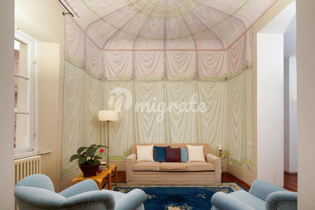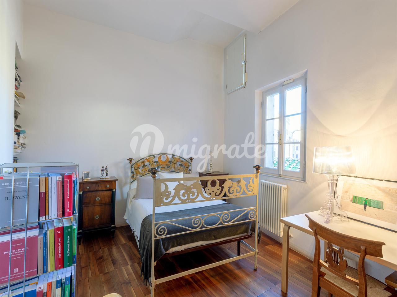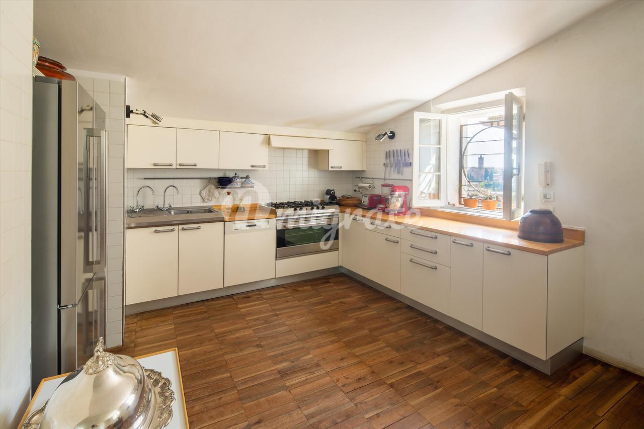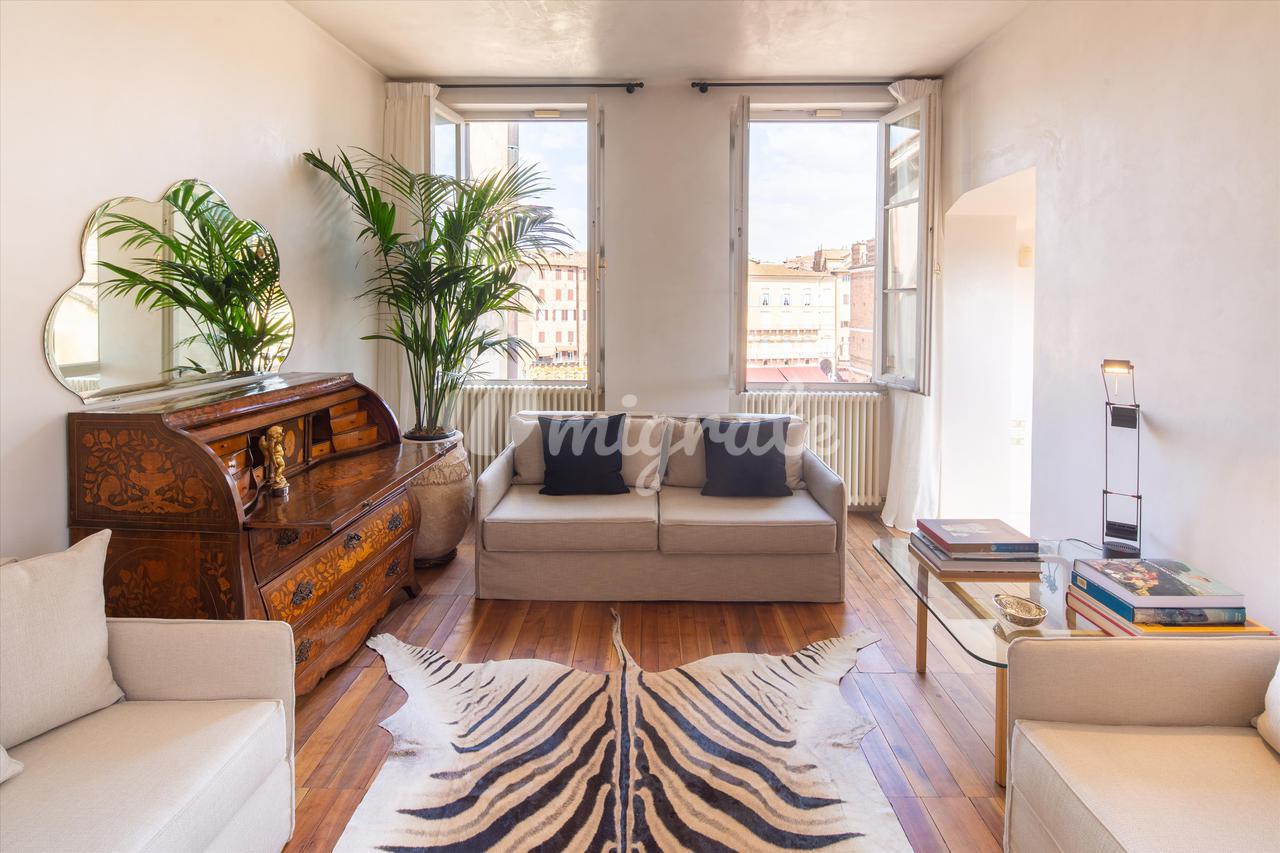 Квартира на втором этаже в элегантном палаццо недалеко от площади Пьяцца дель Кампо. Просторные и светлые апартаменты расположены на двух этажах с большой панорамной террасой и балконом, с которых открывается вид на красивые крыши Сиены, площадь и окружающие холмы к югу от города. Квартира была отреставрирована нынешними владельцами с паркетными полами из орехового дерева и мраморными ванными комнатами. От входной двери большой холл с главной спальней: спальня, гардеробная и ванная комната с двойной мраморной раковиной, ванной-джакузи и душем; студия, столовая и двойная гостиная с окнами, выходящими на площадь и выходом на балкон, вторая гостиная с декорациями в стиле trompe l'oeil, спальня с двумя односпальными кроватями, спальня с видом на площадь, 2 ванные комнаты; один с душем и один с ванной и душем, далее спальня. Большая кухня-столовая с открытым камином. Гостевая ванная комната с душевой кабиной. Лестница в прачечную и большое хранилище на крыше, а также в гостиную с камином с захватывающим видом и дверью на террасу c. 24 кв.м. В продаже есть подвал.