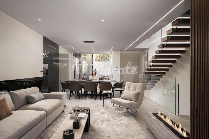 Это свойство имеет современный дизайн и расположено на трех этажах. Он предлагает около 208 кв м жилой площади и находится на участке около 512 кв м с садом и бассейном. На первом этаже есть прихожая,