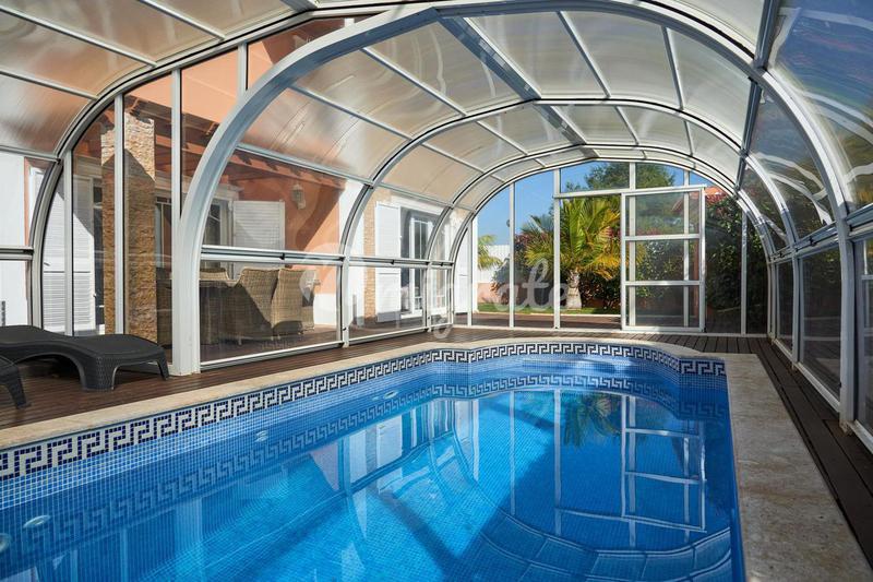 Этот двухэтажный дом имеет крышу с видом на море. На первом этаже есть прихожая и гостиная на южной стороне с выходом в сад и к бассейну с подогревом (длиной 17 метров) с гидромассажной ванной. В гост