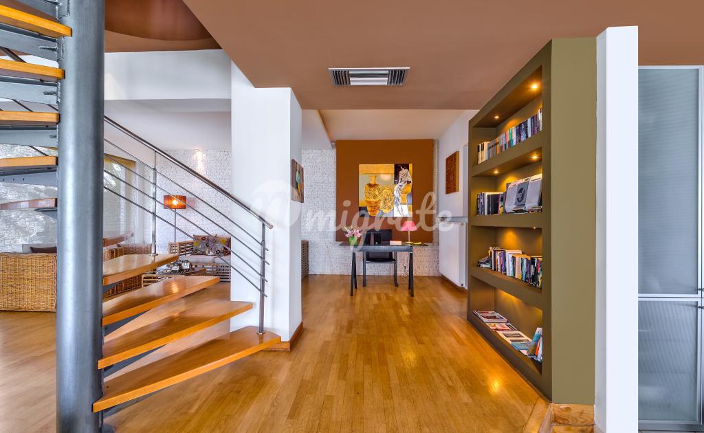 Вилла площадью 305 м² имеет на первом этаже: открытую гостиную и столовую, камин, туалет, кухню, небольшую спальню и кладовую. Деревянная лестница ведет на второй этаж, где расположены 2 лофта со спальней, туалетом, кабинетами и рабочими зонами, а также главная спальня с камином, джакузи, туалетом и гардеробной площадью около 63 м². Из всех комнат на втором этаже открывается вид на море и горы.