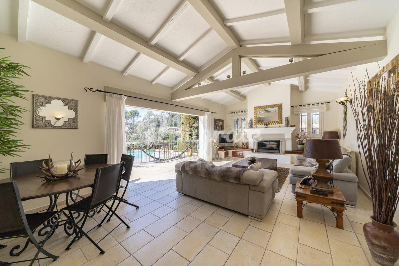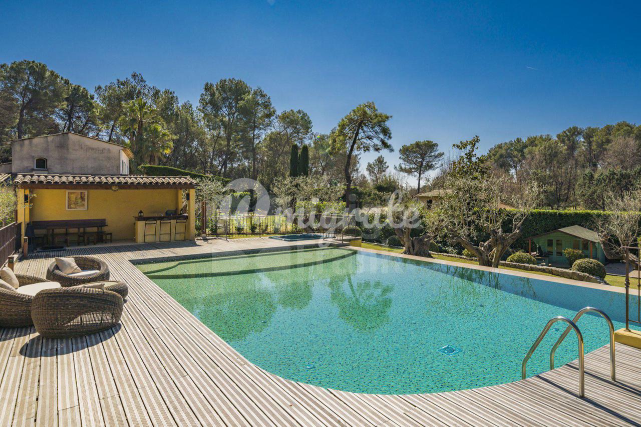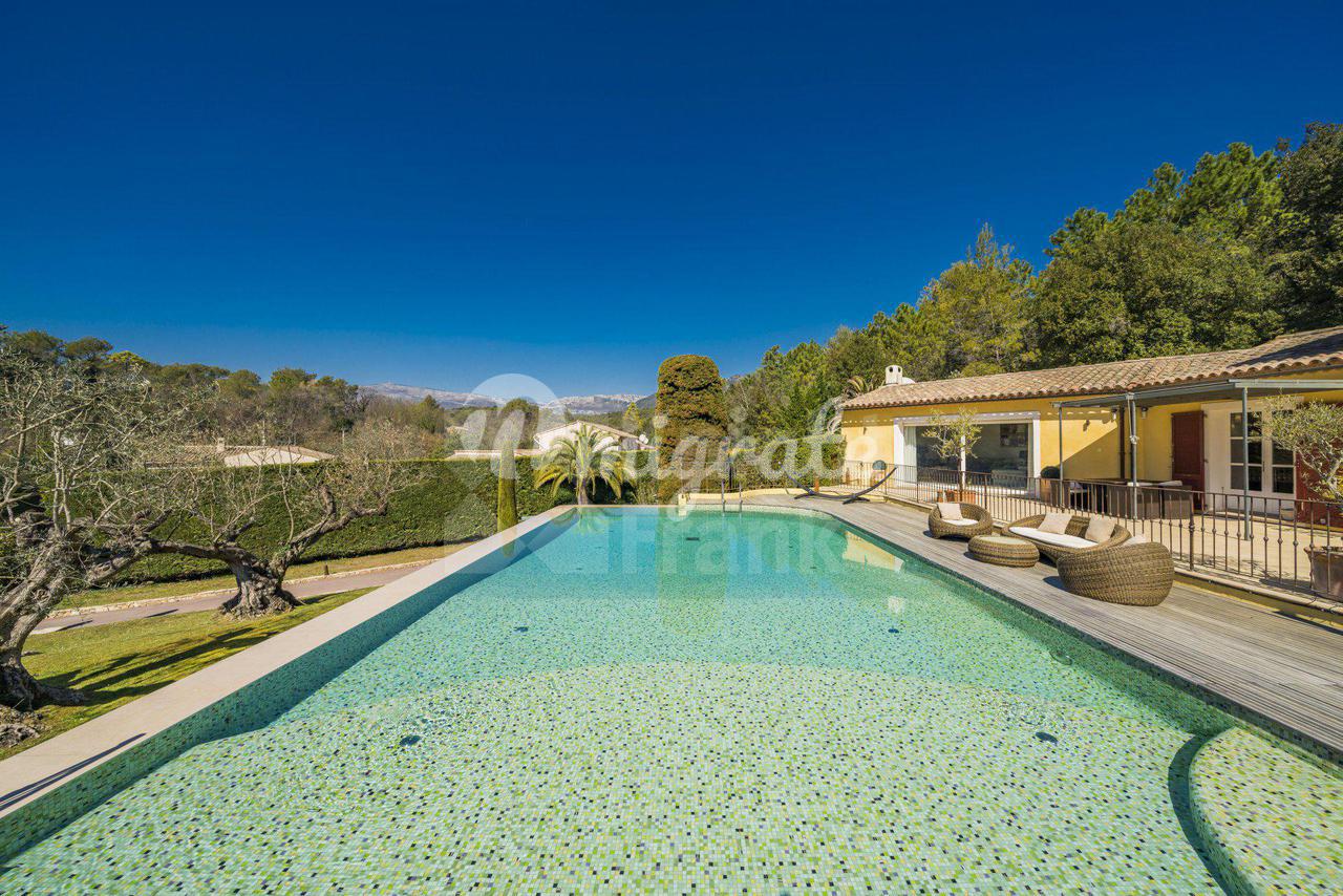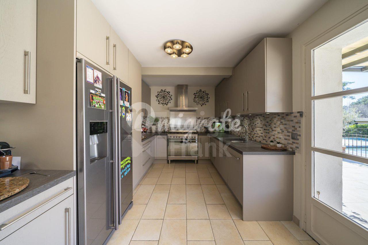 Вилла расположена в тихом жилом районе в городке Рокфор-Ле-Пен, в нескольких минутах езды от центра города и в 10 минутах от Вальбонн. Вилла включает прихожую с гостевым санузлом, прачечную, просторную гостиную, столовую с камином, полностью оснащенную кухню с выходом на террасу к бассейну, кабинет, 4 спальни и 3 ванные комнаты.