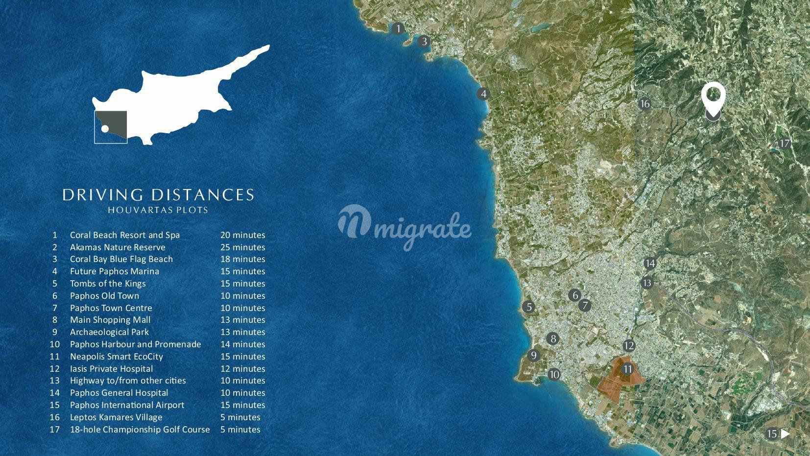 Земельный участок в Хувартасе На этом участке земли, расположенном на холмах над Пафосом, рядом с полем для гольфа Tsada, находится элегантный комплекс Olympus Villas. Эти участки тщательно подобраны таким образом, чтобы жители могли наслаждаться захватывающими дух панорамными видами на море и загородную местность Средиземноморья. Эти роскошные места отличаются повышенной летней влажностью, предлагая преимущества здорового климата и освежающего горного бриза.