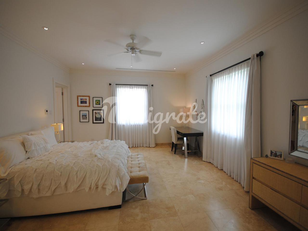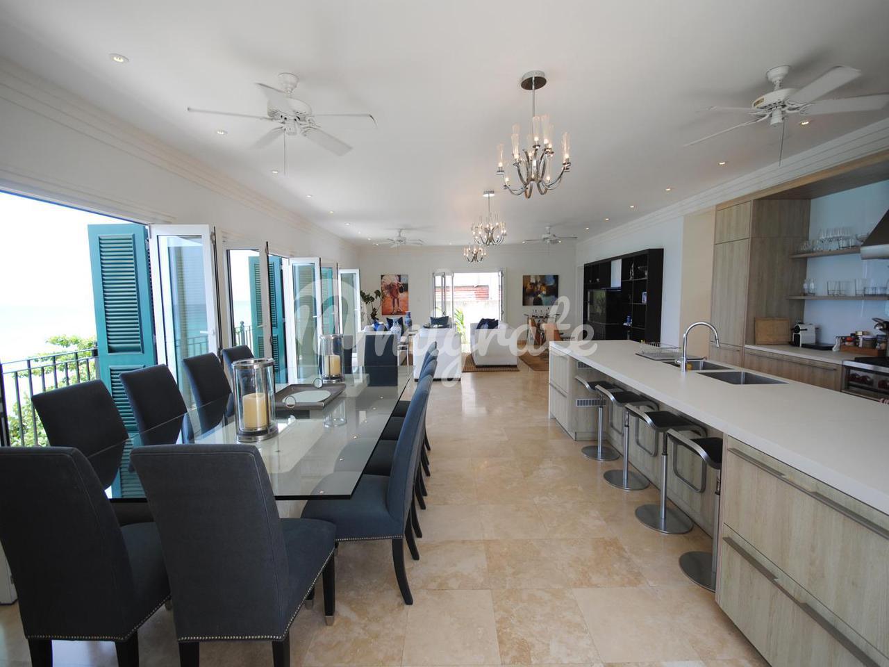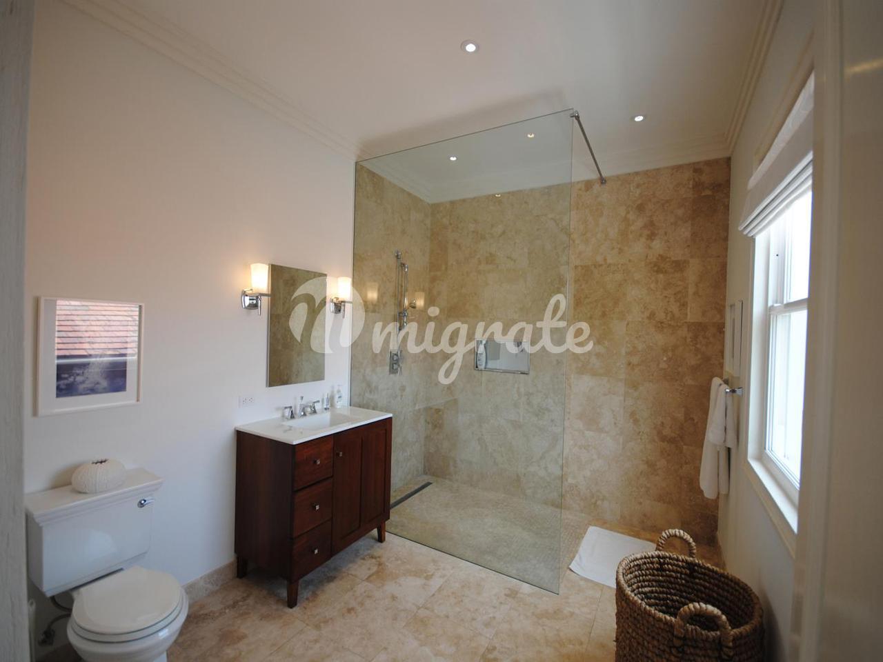На начальном уровне вид на море начинается у входной двери - здесь есть гостиная открытой планировки, столовая и кухня, а также большая медиа-комната с удобными креслами, офис и отдельная игровая комната, а также вторая кухня / кладовая и прачечная. Есть несколько высоких складных стеклянных дверей, которые ведут на балкон, выходящий на запад, и ведут к бассейну и беседке у бассейна. Лестница ведет отсюда вниз на нижний уровень через безопасные ворота на прекрасный пляж.