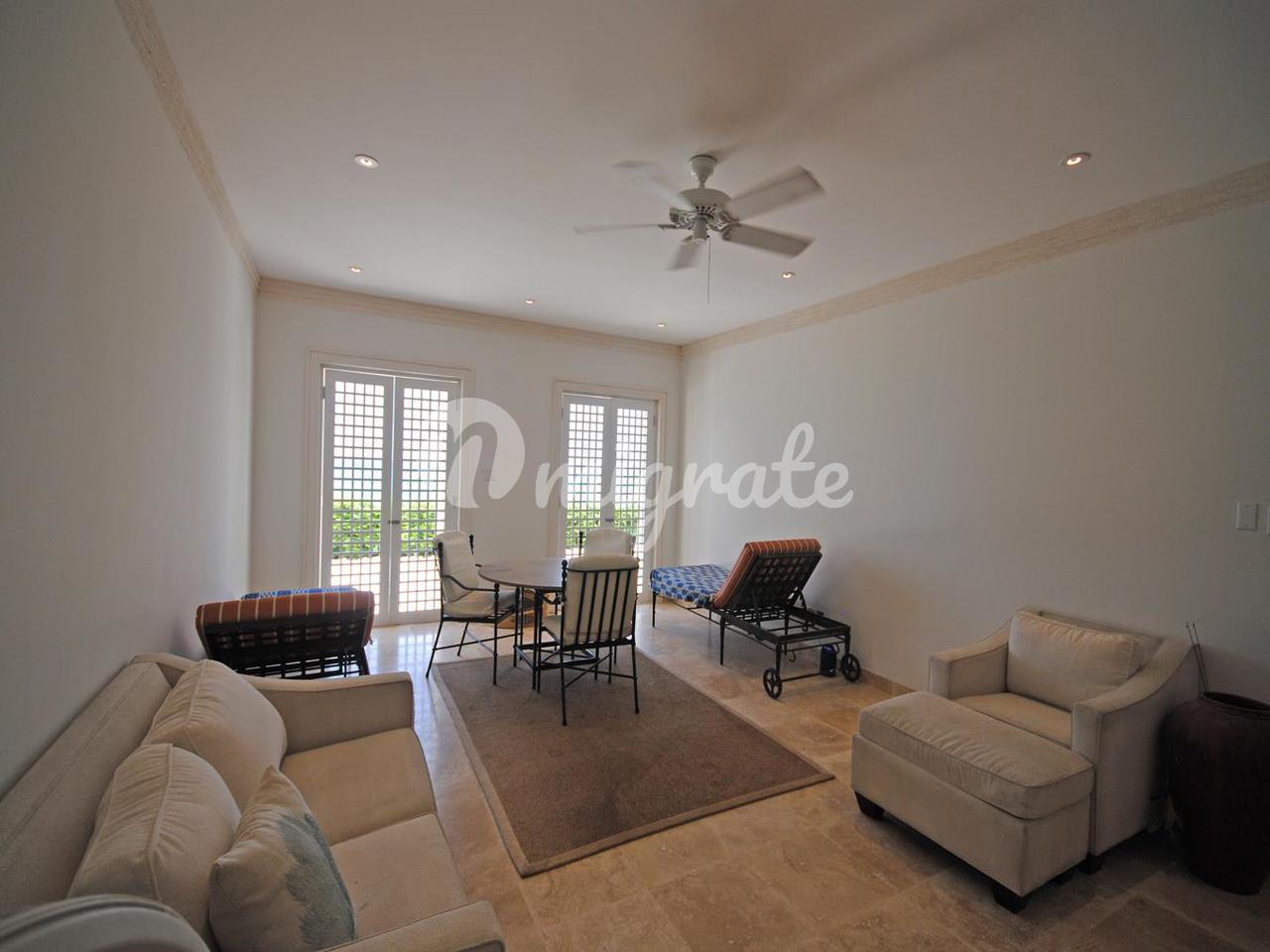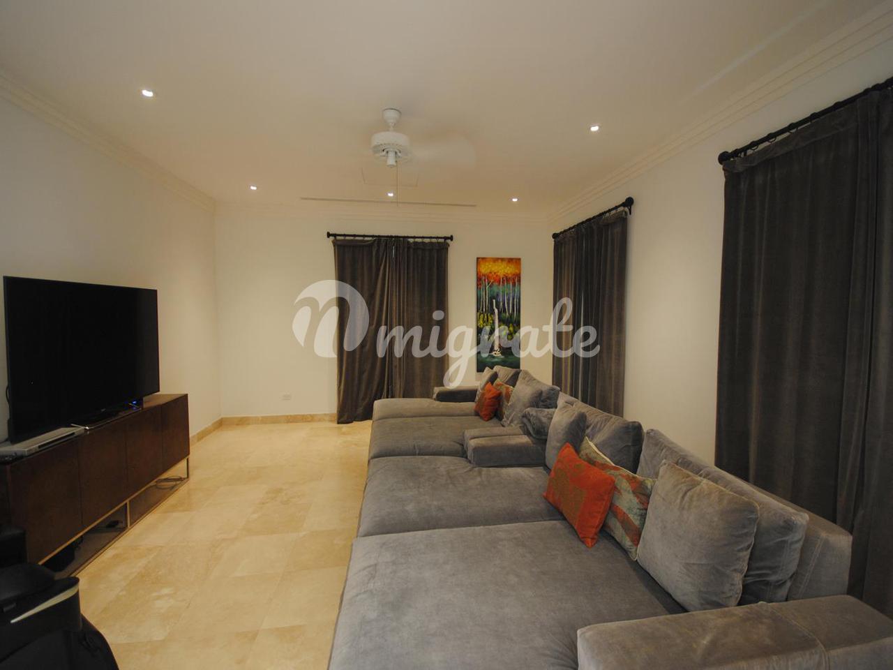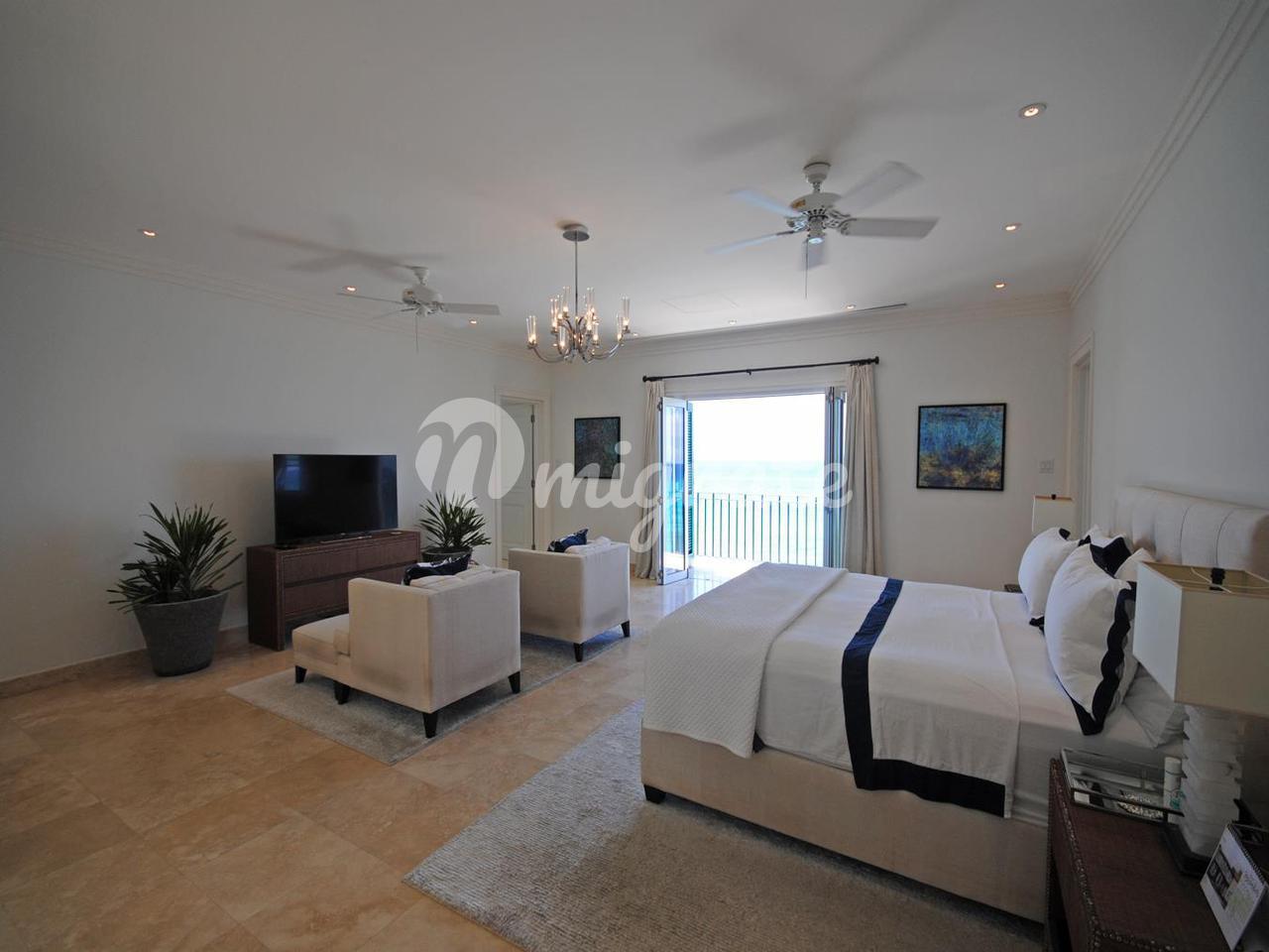 На начальном уровне вид на море начинается у входной двери - здесь есть гостиная открытой планировки, столовая и кухня, а также большая медиа-комната с удобными креслами, офис и отдельная игровая комната, а также вторая кухня / кладовая и прачечная. Есть несколько высоких складных стеклянных дверей, которые ведут на балкон, выходящий на запад, и ведут к бассейну и беседке у бассейна. Лестница ведет отсюда вниз на нижний уровень через безопасные ворота на прекрасный пляж.