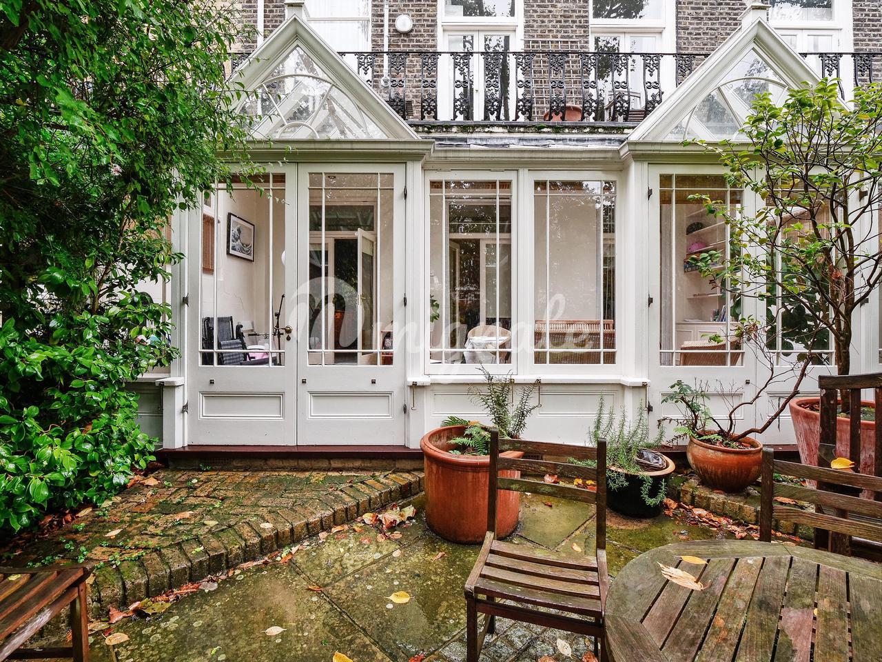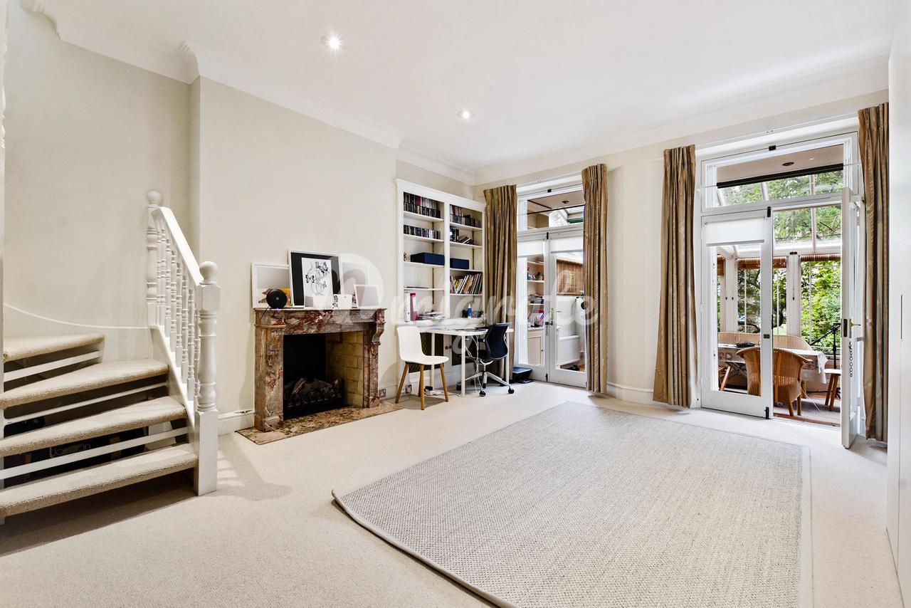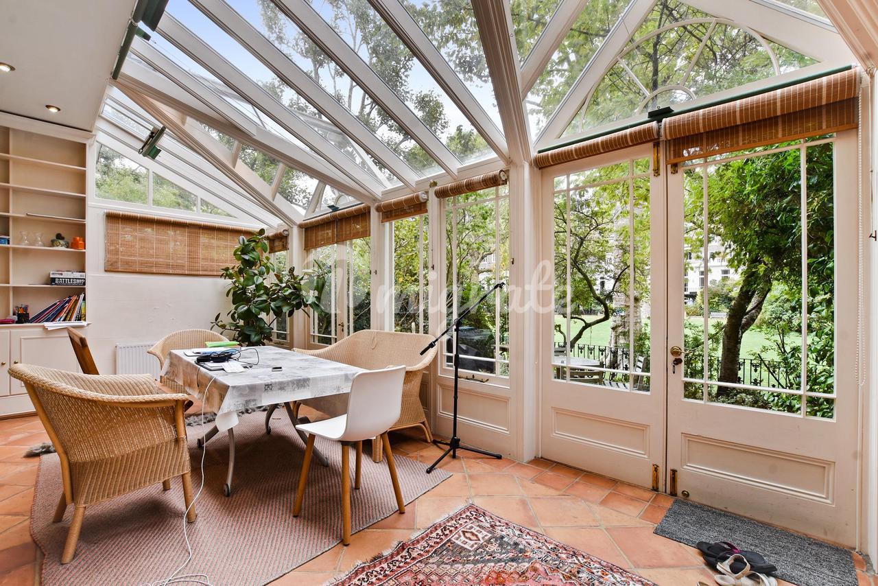 Приподнятый цокольный этаж может похвастаться невероятной высотой потолков, что обеспечивает обилие естественного света. Из главной приемной открывается вид на коммунальные сады, а также к ней можно пройти напрямую по лестнице. Из гостиной есть выход на южную сторону балкона. Есть также две спальни на этом уровне с семейной ванной и душевой комнатой. Нижний этаж, где вы найдете главный вход в собственность, имеет большое пространство и является домом для второй гостиной, а также отдельной кухни. Приемная и кухня перетекают прямо в исключительно редкий зимний сад в задней части дома, который затем дает доступ к частному саду во внутреннем дворике, а затем к общему саду.