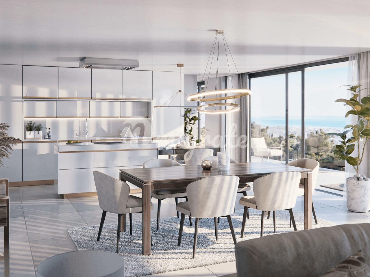 На втором этаже есть две спальни с ванными комнатами, туалет и так называемая зимняя гостиная, объединяющая гостиную, столовую и полностью оборудованную встроенную кухню. Все это с выходом на открытую террасу площадью около 62 м2 с захватывающим видом на море и окрестности.