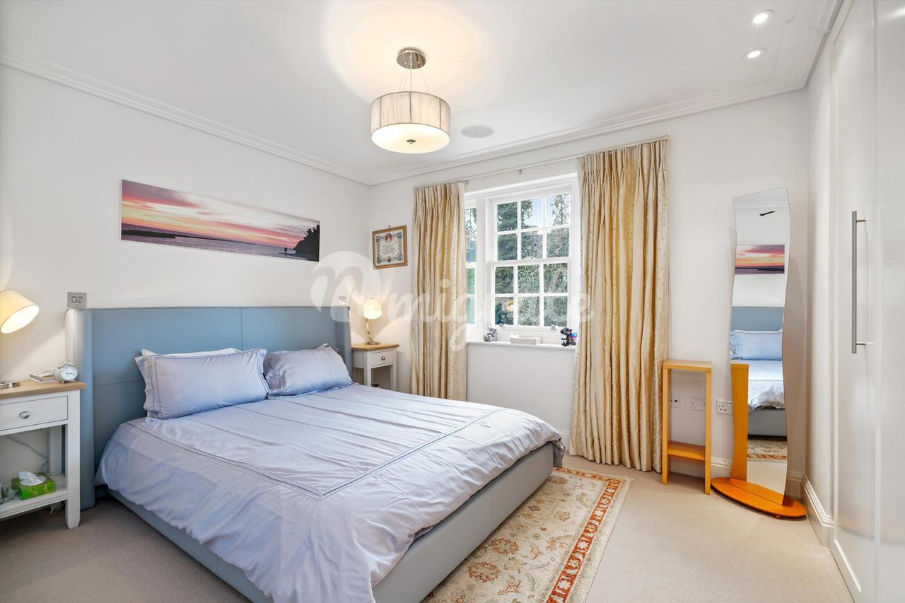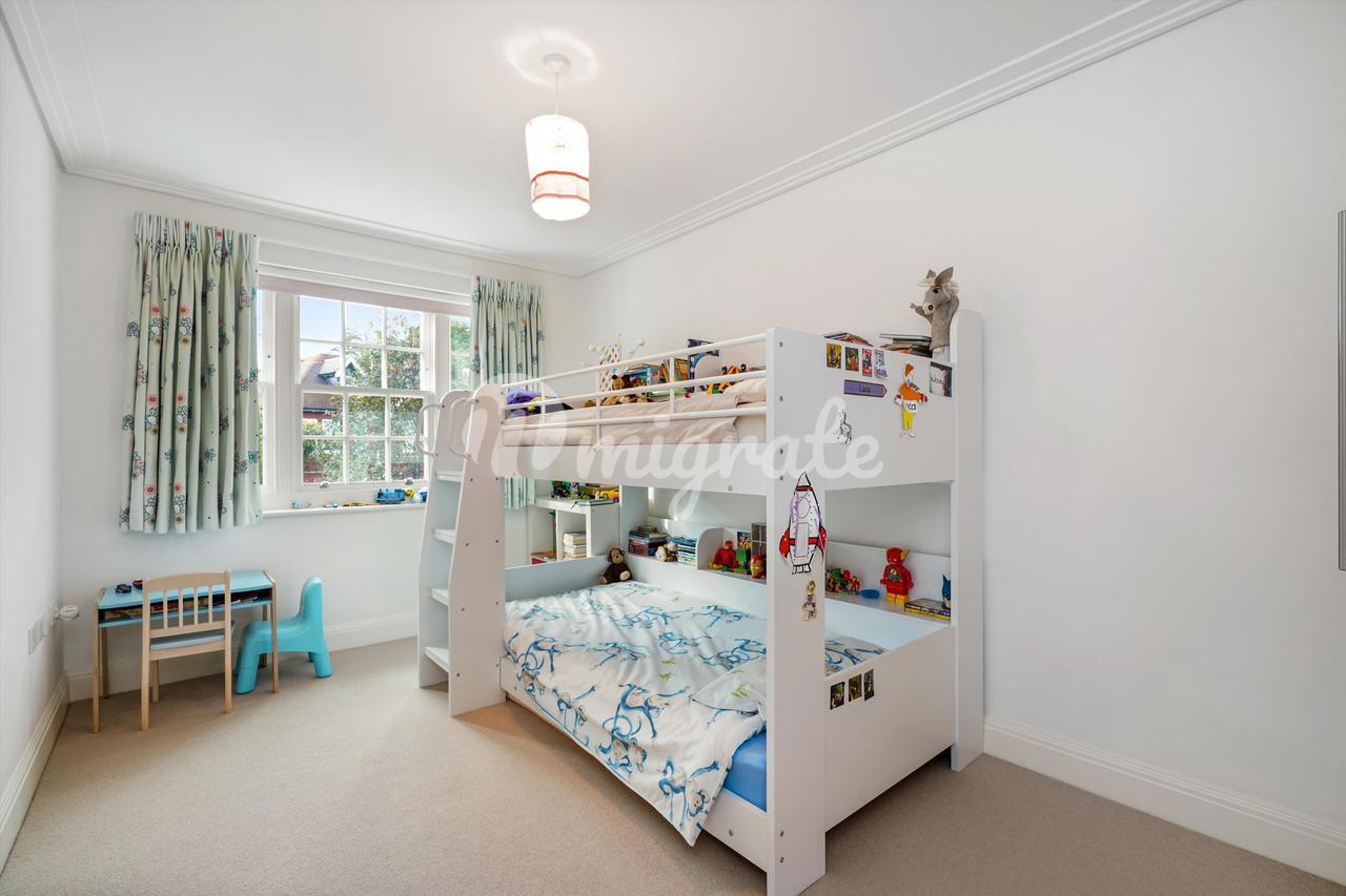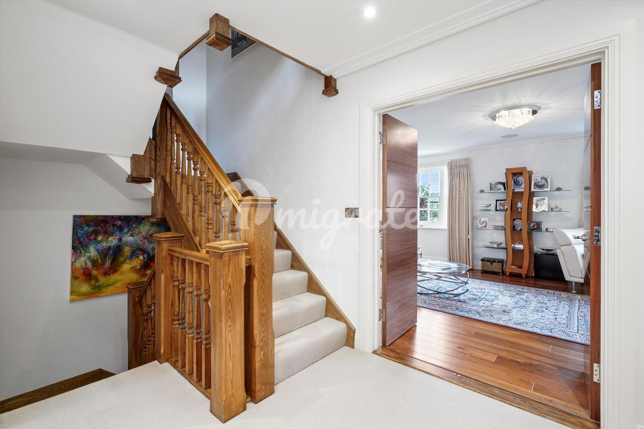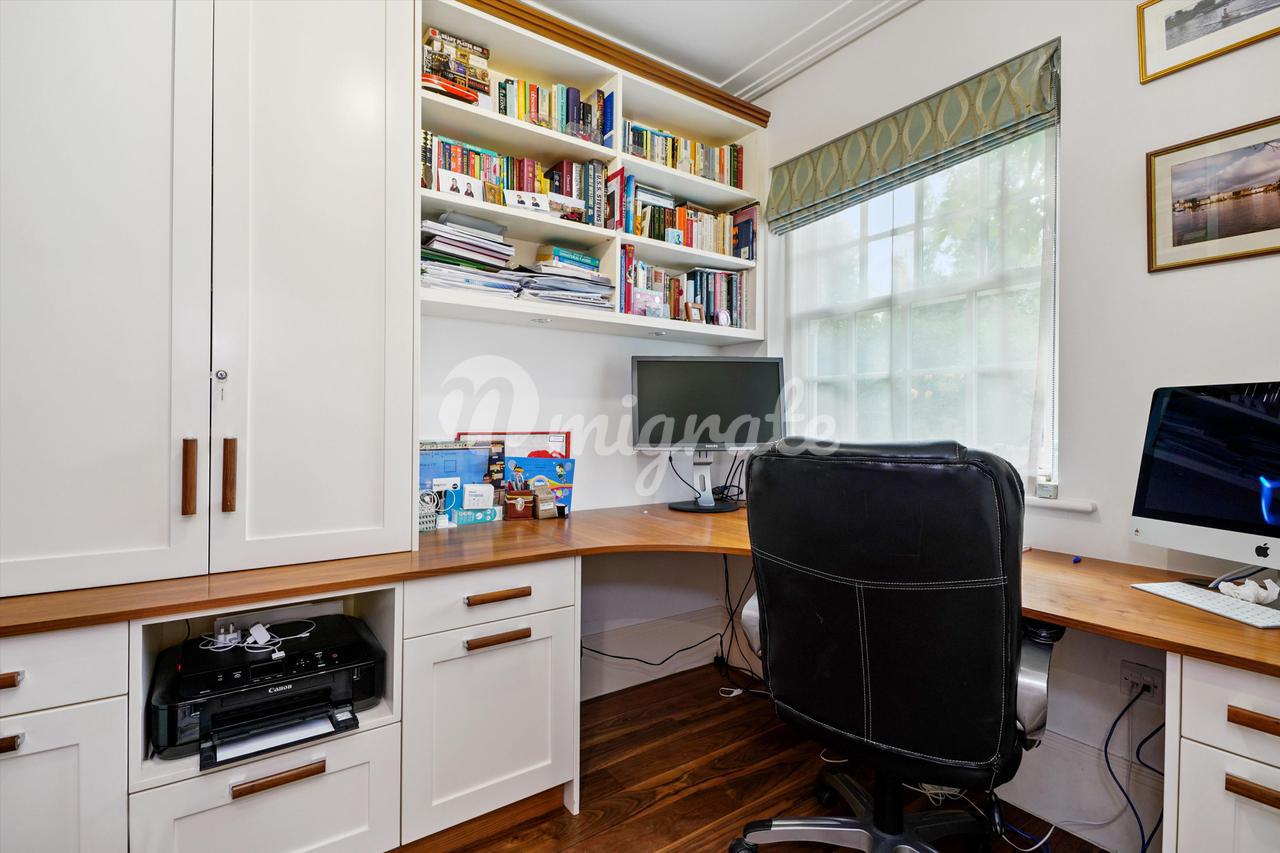 На нижнем этаже также есть большое подсобное помещение, кабинет, гостевая гардеробная и дверь в встроенный гараж. На первом этаже находится формальная гостиная с видом на сад. Основная спальня также расположена на первом этаже вместе со спальней и ванной комнатой. На втором этаже расположены две спальни с ванными комнатами, обе с гардеробными. В доме высокие потолки, встроенная звуковая система и полы с подогревом на первом и втором этажах.