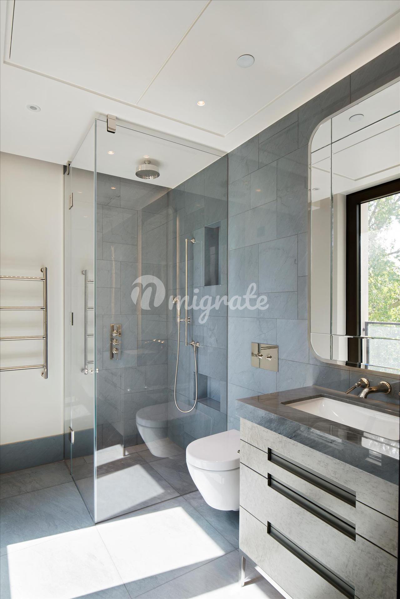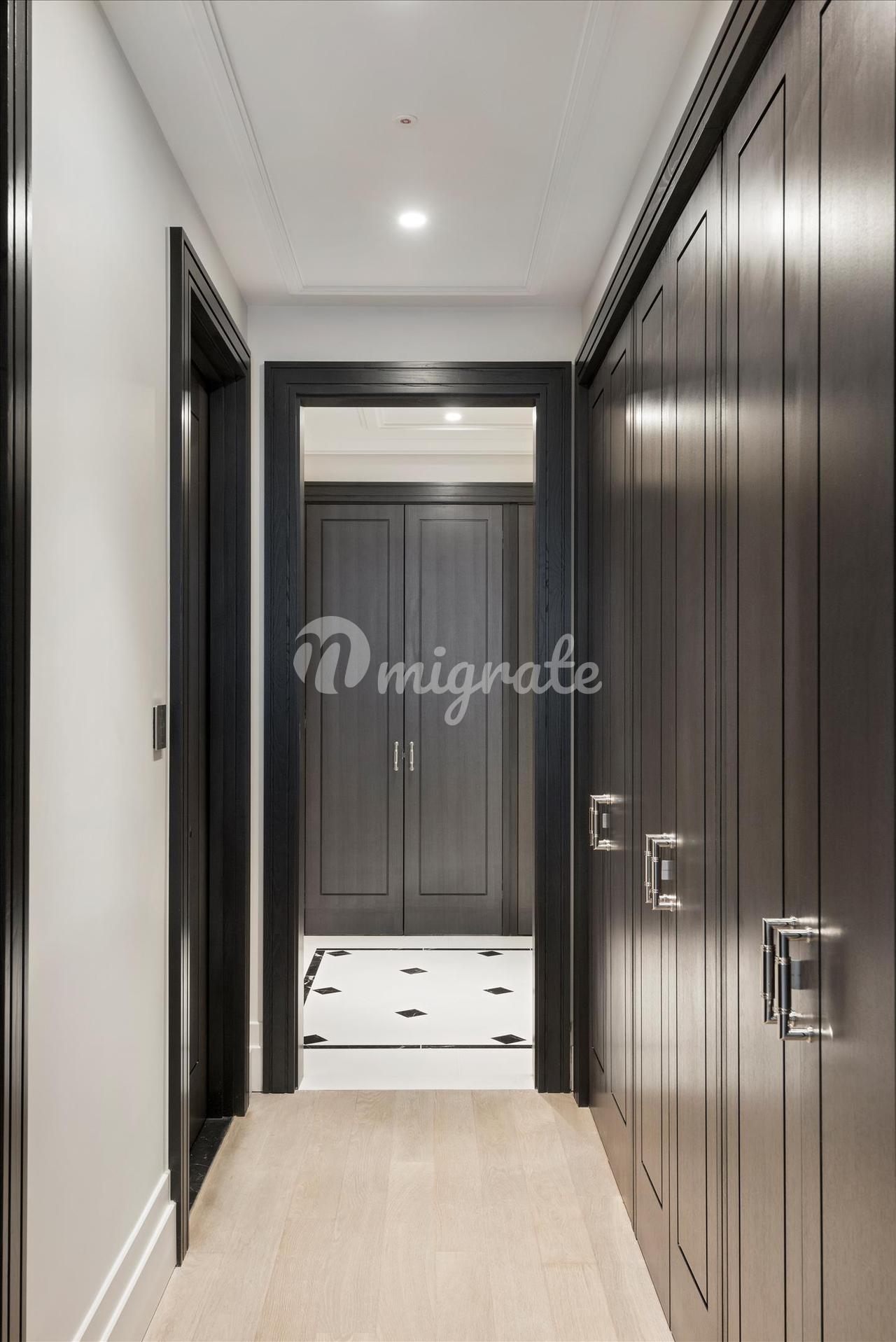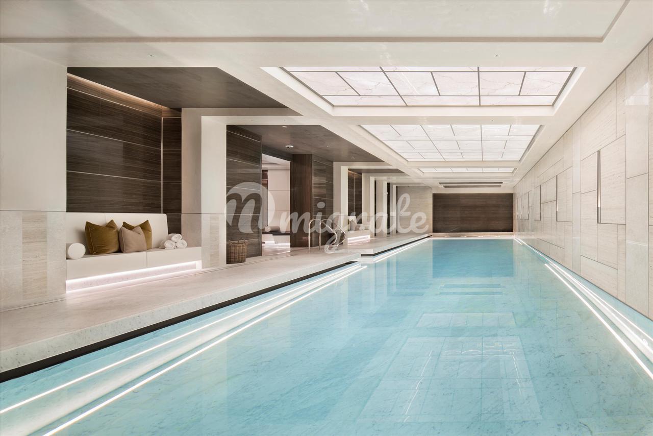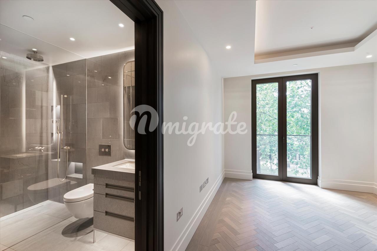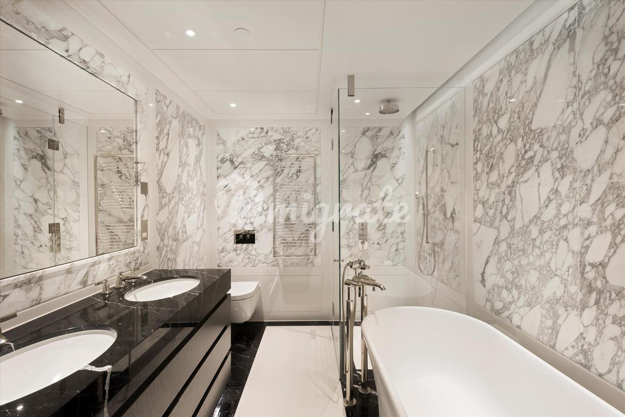 Просторную главную спальню дополняет гардеробная с изготовленными на заказ столярными изделиями из темного дерева и вставками из кожаных панелей, выдвижными ящиками и встроенным освещением. Отдельные балконы главной спальни и второстепенных спален предоставляют уникальную возможность полюбоваться легендарным видом на Лондон. В каждой спальне есть собственная ванная комната, отделанная натуральным камнем премиум-класса, никелированные краны ручной полировки и туалетные столики. Великолепная главная ванная комната с мраморными стенами в тон книгам и сделанным на заказ туалетным столиком создает роскошное место для отдыха и расслабления.