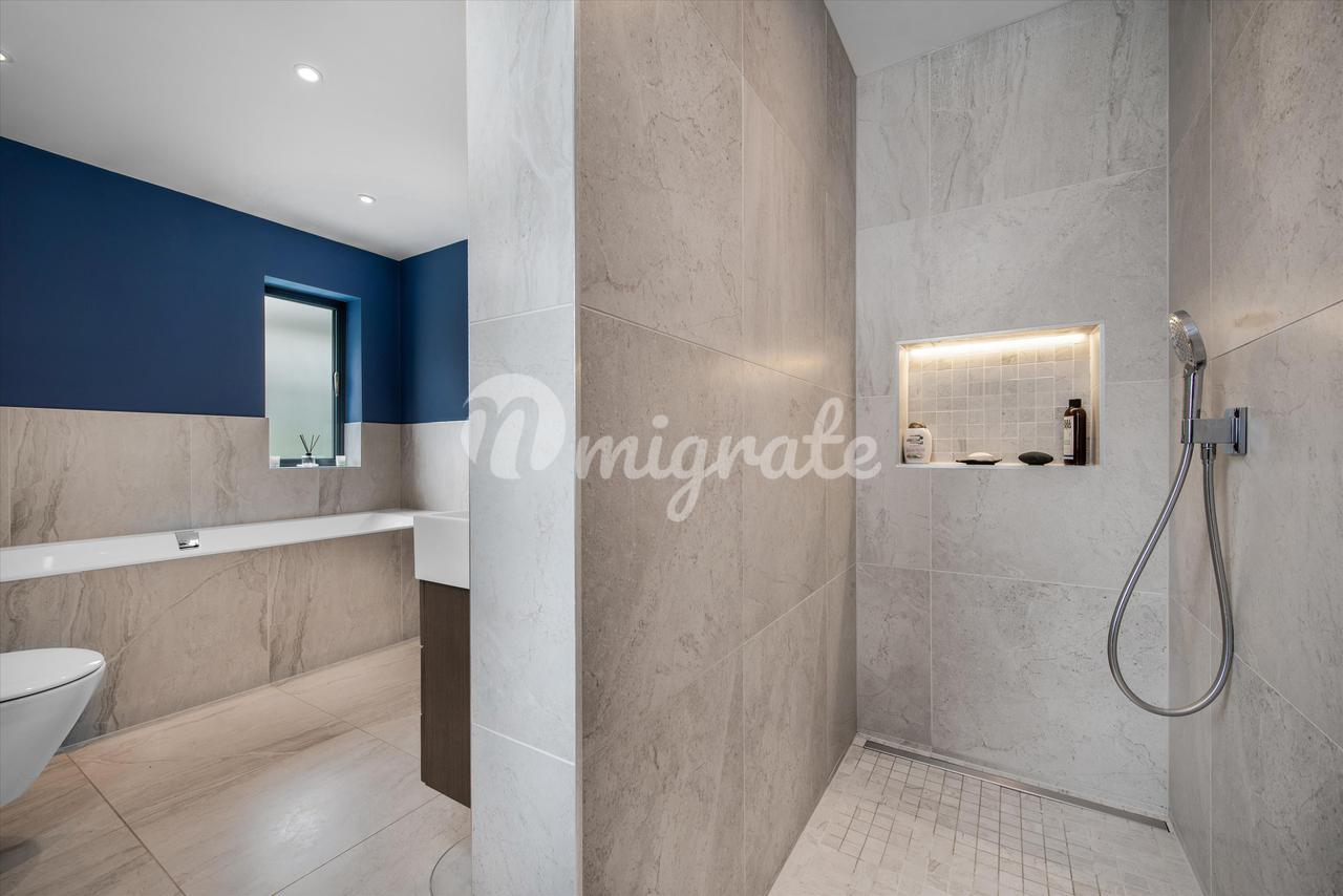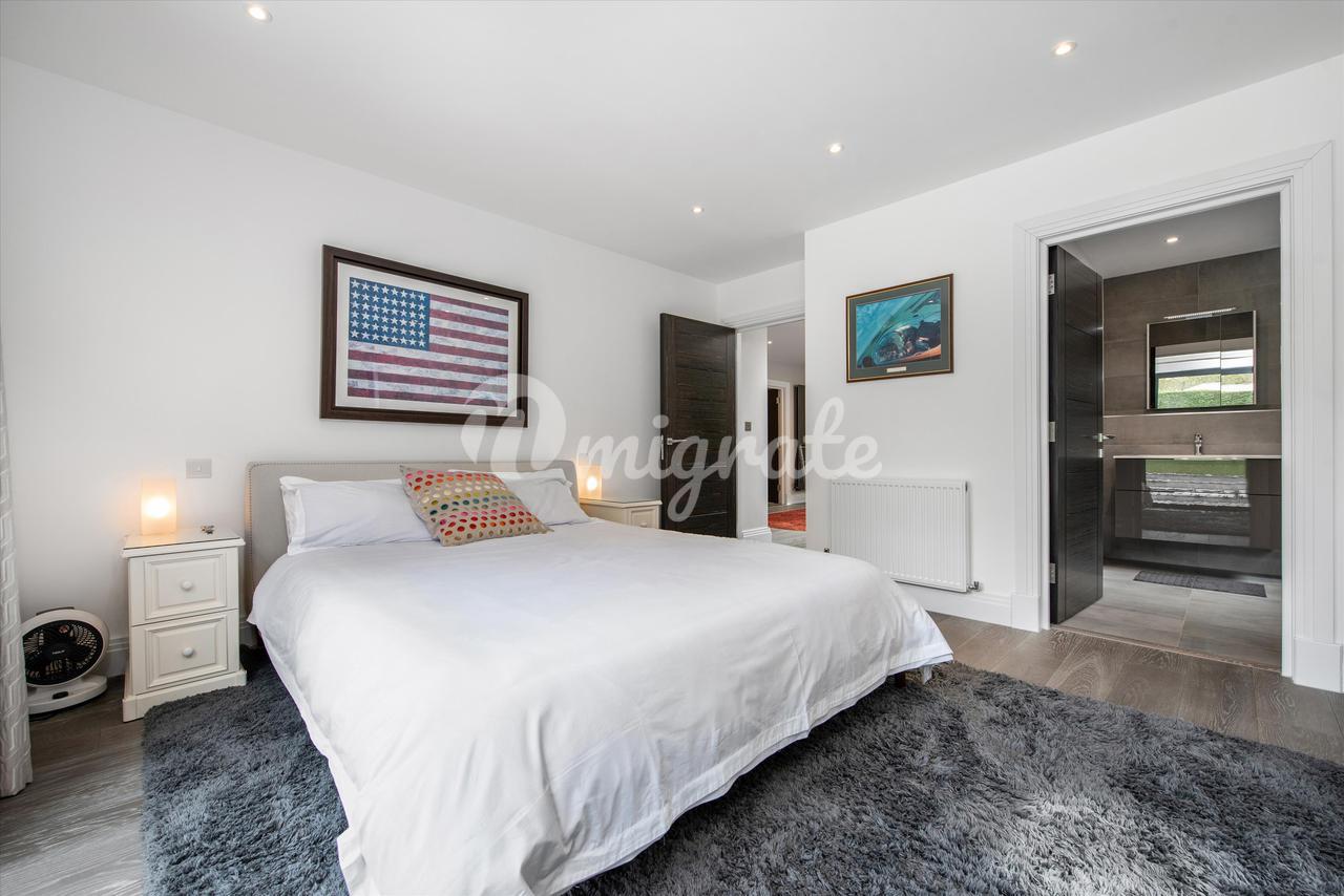 На первом этаже в главной спальне есть гардеробная, ванная комната с ванной и душевой кабиной. Есть спальня для гостей и еще две спальни, каждая из которых обслуживается семейной ванной комнатой.