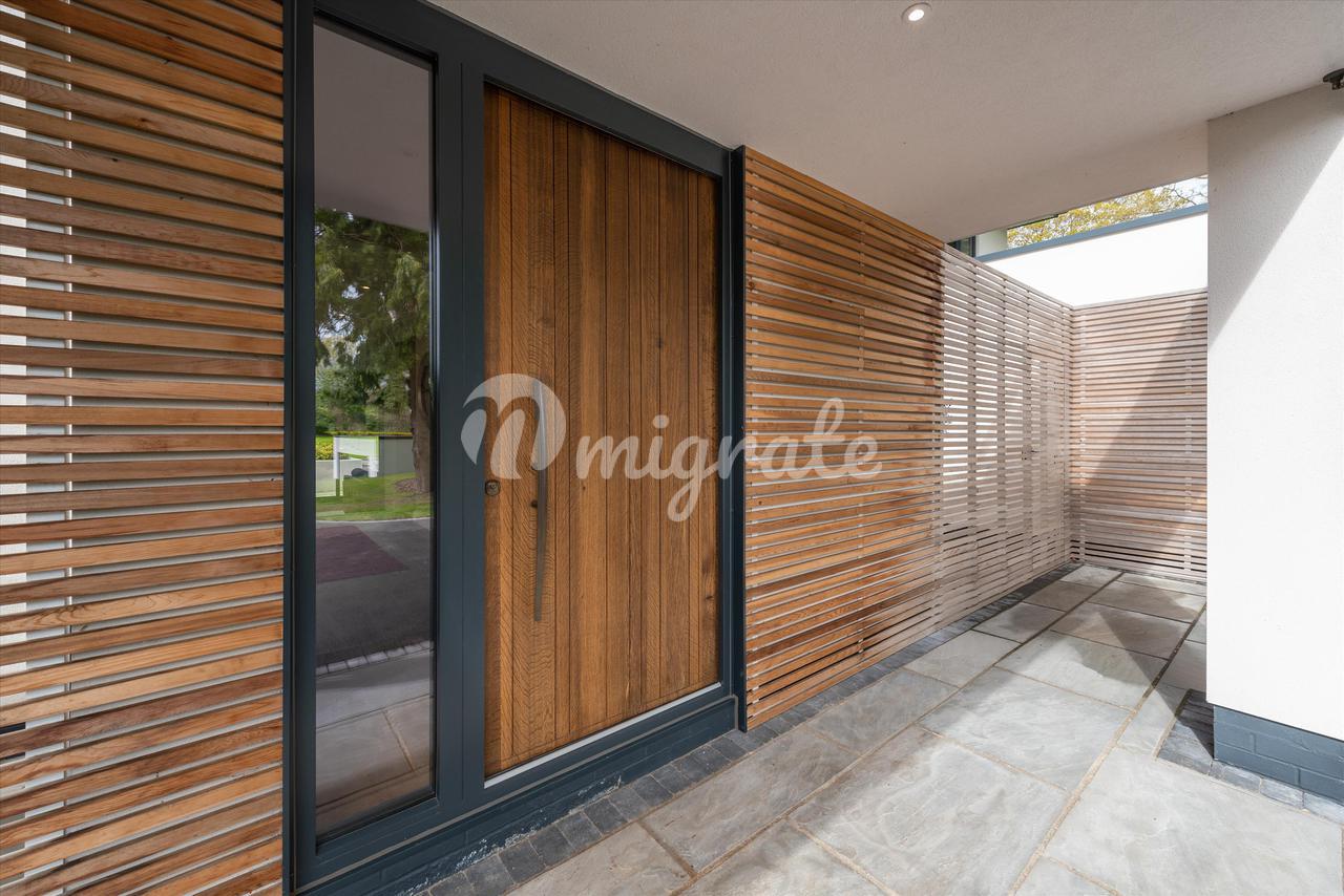 Спереди собственность имеет привлекательный подход с приподнятой подъездной дорожкой, предлагающей просторную парковку, а также тройной гараж.