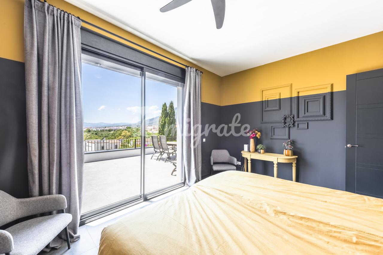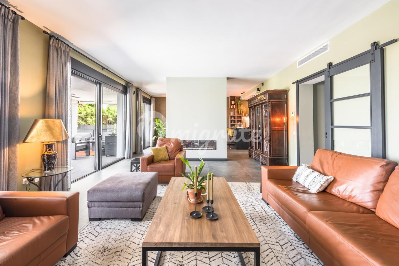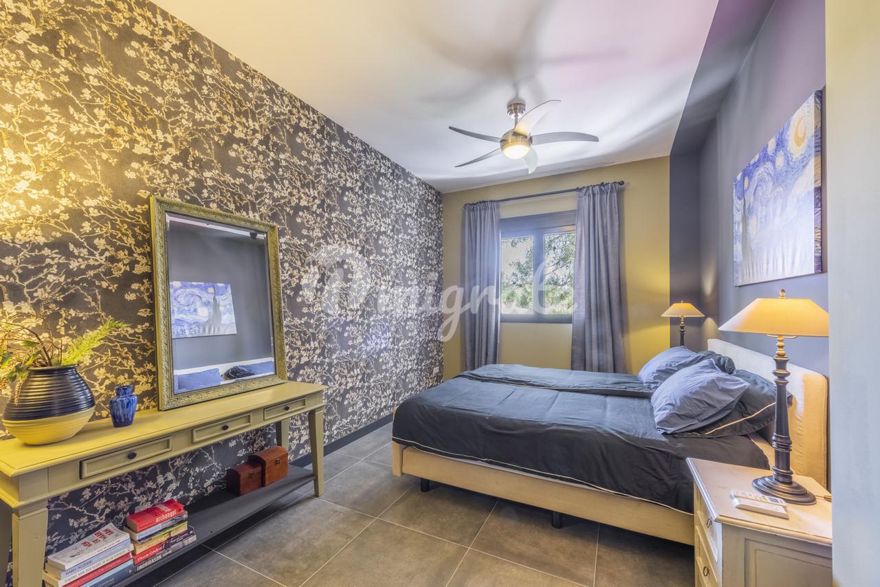На первом этаже мы находим гостиную, столовую с газовым камином с дистанционным управлением, полностью оборудованную кухню открытой планировки с немецкой техникой, столешницей из черного гранита с дополнительной барной стойкой, встроенным светодиодным освещением с контроллером и гостевой туалет. К услугам гостей крытая терраса площадью 60 м2 с площадкой для барбекю и бассейн с морской водой размером 10 х 4 метра, выложенный специальной плиткой, которая придает открытой площадке неповторимый вид. На верхнем уровне находится главная спальня с собственной ванной комнатой, большой гардеробной и прямым выходом на террасу площадью 60 м2 с видом на море и горы. Есть также две спальни с общей ванной комнатой, одна из которых выходит на террасу.