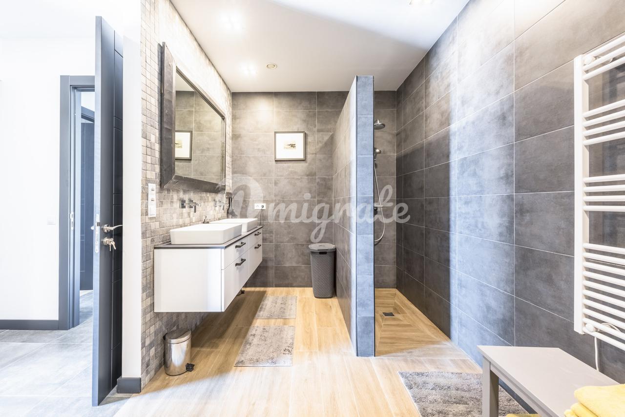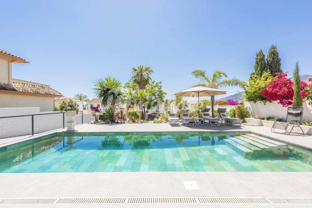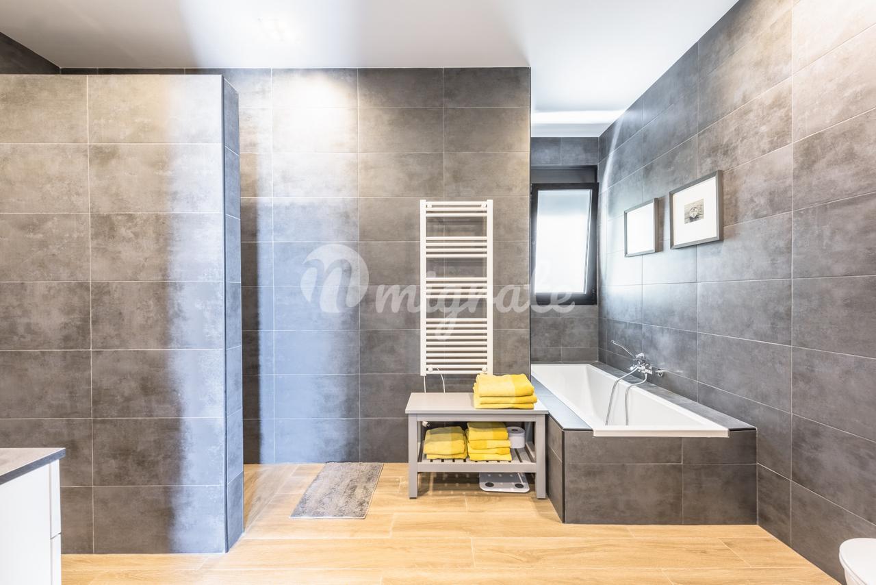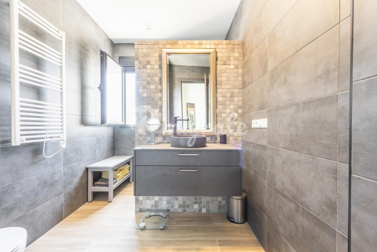 На первом этаже мы находим гостиную, столовую с газовым камином с дистанционным управлением, полностью оборудованную кухню открытой планировки с немецкой техникой, столешницей из черного гранита с дополнительной барной стойкой, встроенным светодиодным освещением с контроллером и гостевой туалет. К услугам гостей крытая терраса площадью 60 м2 с площадкой для барбекю и бассейн с морской водой размером 10 х 4 метра, выложенный специальной плиткой, которая придает открытой площадке неповторимый вид. На верхнем уровне находится главная спальня с собственной ванной комнатой, большой гардеробной и прямым выходом на террасу площадью 60 м2 с видом на море и горы. Есть также две спальни с общей ванной комнатой, одна из которых выходит на террасу.