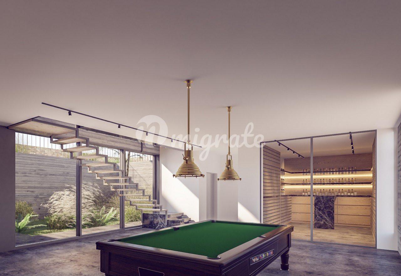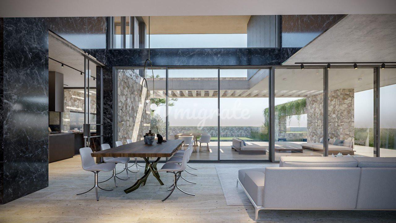 Резиденция включает в себя гостиную и столовую открытой планировки, а также кухню полуоткрытой планировки, зону отдыха на открытом воздухе и обеденную зону рядом с пейзажным бассейном.