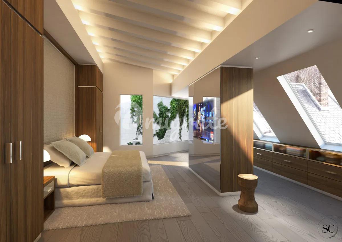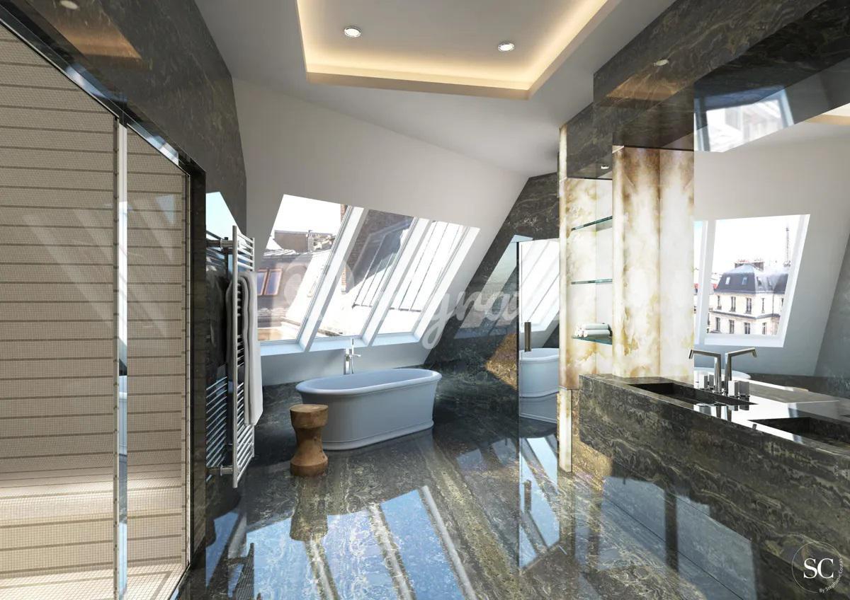Апартаменты от известного дизайнера расположены в 8 округе Парижа и включают в себя прихожую, гостиную с великолепными стеклянными крышами и потолками высотой 6 м, столовую, оборудованную кухню, 3 спальни, 3 ванные комнаты, шикарную террасу.
