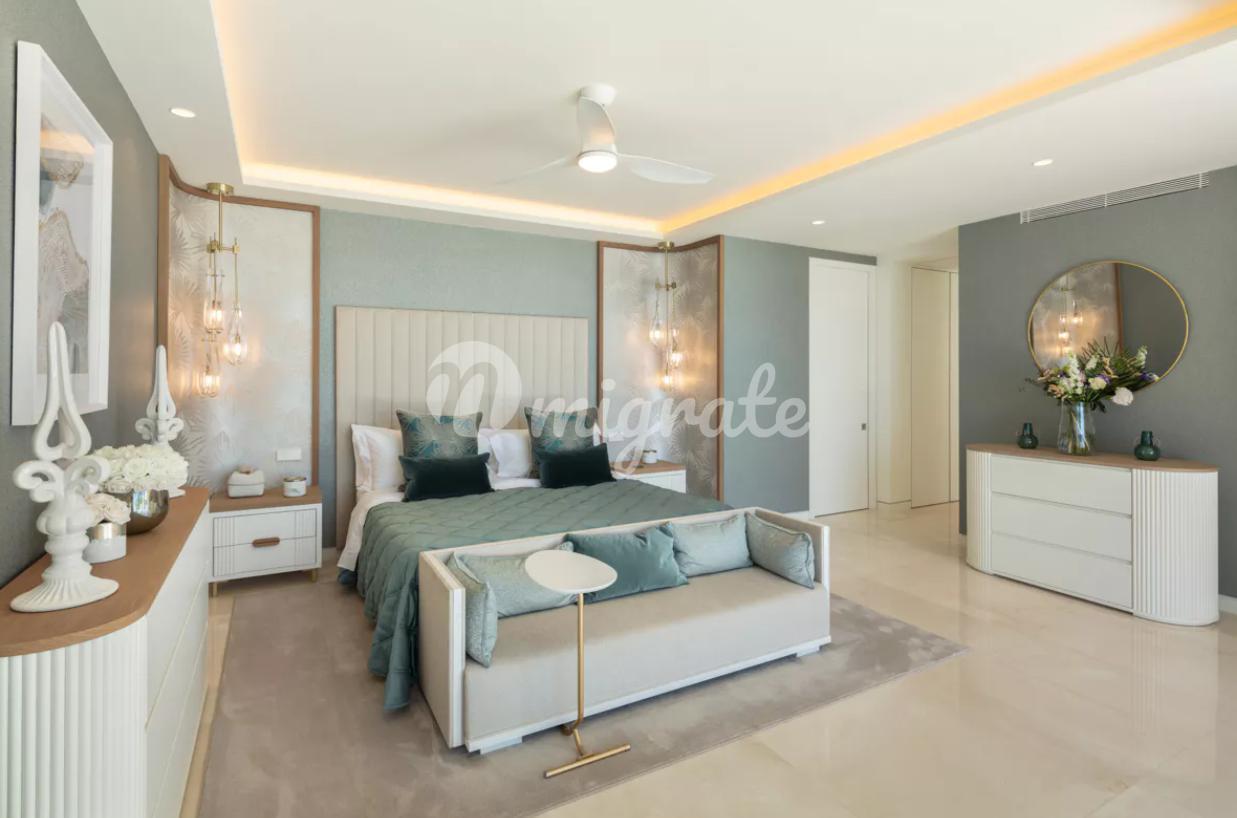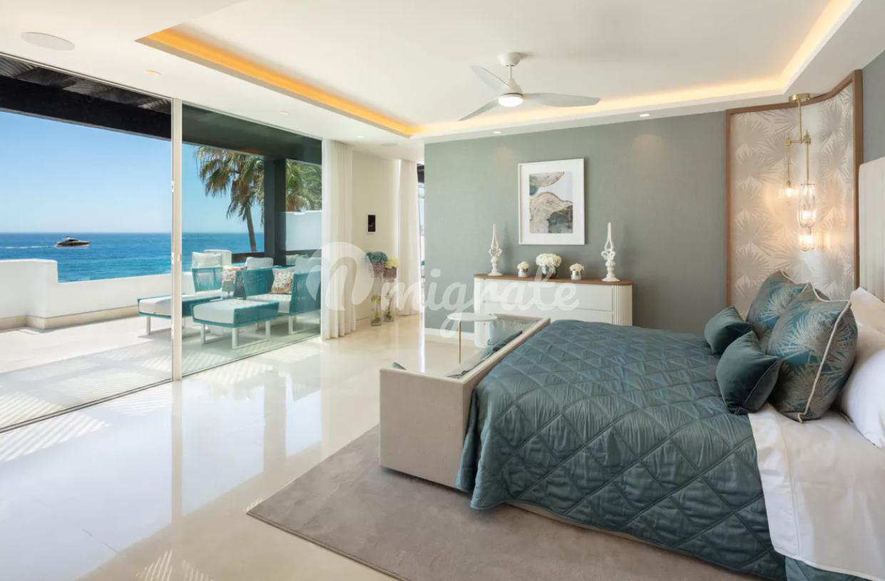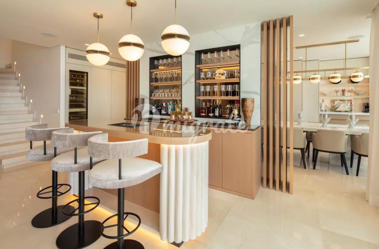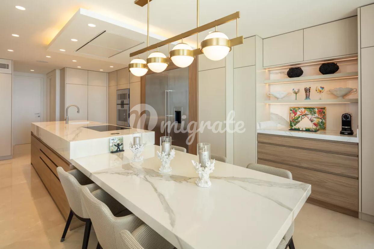 Красивые и изысканные апартаменты с 5 спальнями оформлены в современном стиле. На первом этаже находится просторная гостиная с камином, который разделяет гостиную на две жилые зоны. Кухня открытой планировки с центральным островом и обеденной зоной ведет на полузакрытую террасу с барбекю. Гостевой туалет, бар, прачечная и апартаменты с 4 спальнями также находятся на уровне входа в пентхаус. В одной из спален есть собственная терраса с видом на море. Верхний этаж занимают главная спальня и кабинет. Главная спальня с прилегающей гостиной, гардеробная, ванная комната, тренажерный зал и выход на полузакрытую террасу с небольшим бассейном — вот изыски владельца этой недвижимости, уникальной своим расположением и высоким качеством. Недвижимость продается с гаражом на две машины и кладовой.