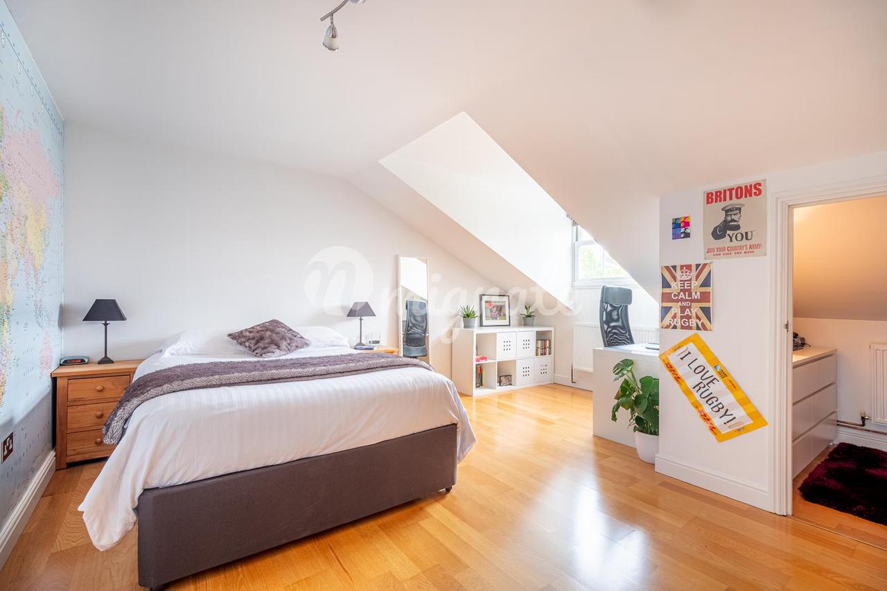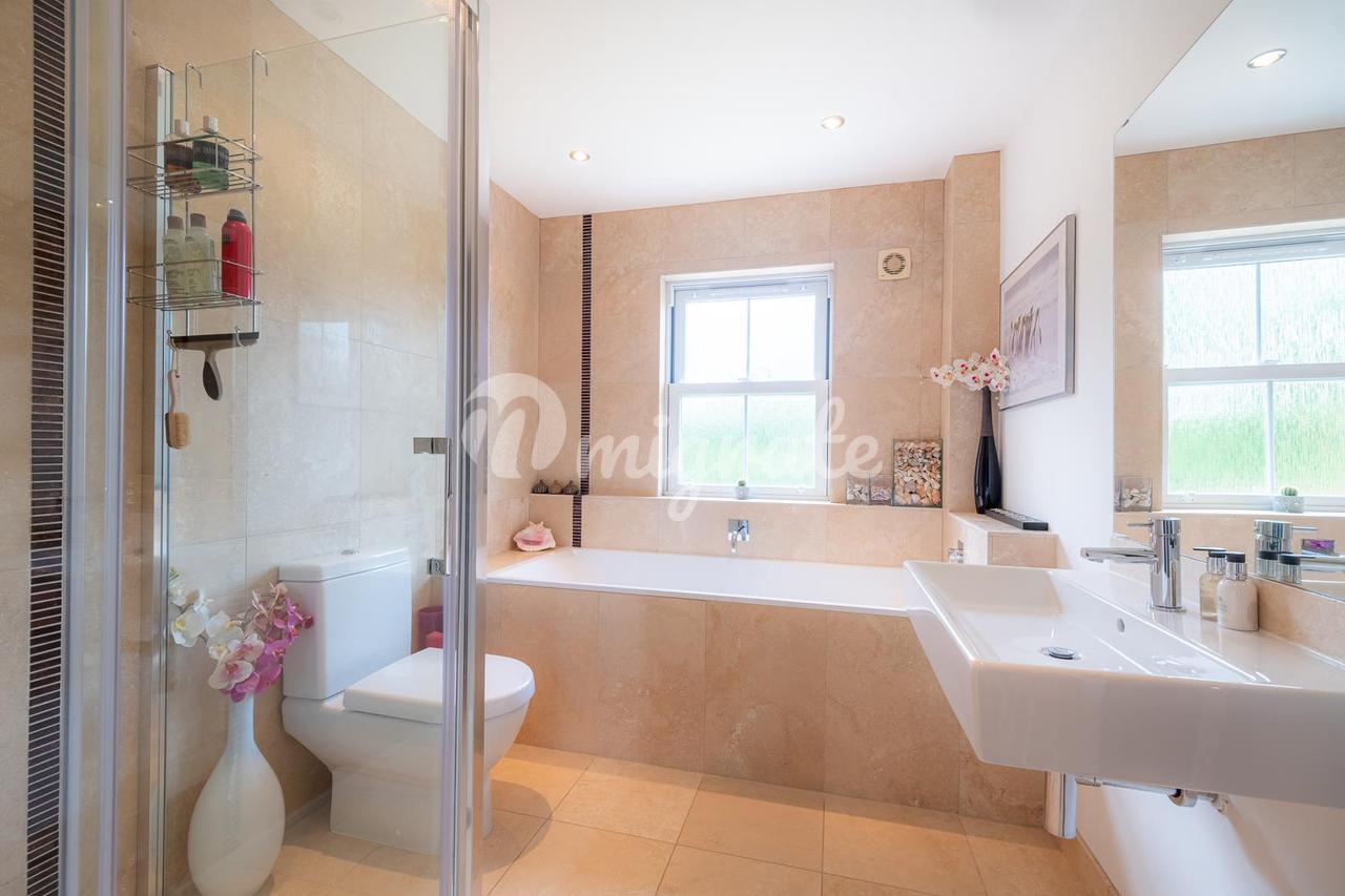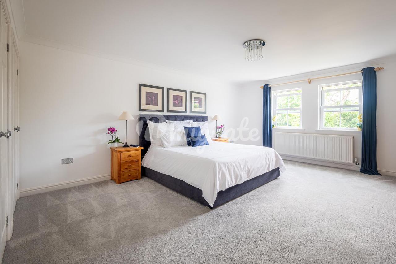 Наверху главная спальня чудесных размеров и выходит в сад сзади. Есть встроенные шкафы и благоустроенная душевая. Есть еще четыре спальни с двуспальными кроватями, все со встроенными кладовыми, которые обслуживаются двумя семейными ванными комнатами с ванной и отдельным душем.