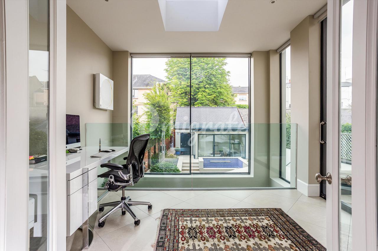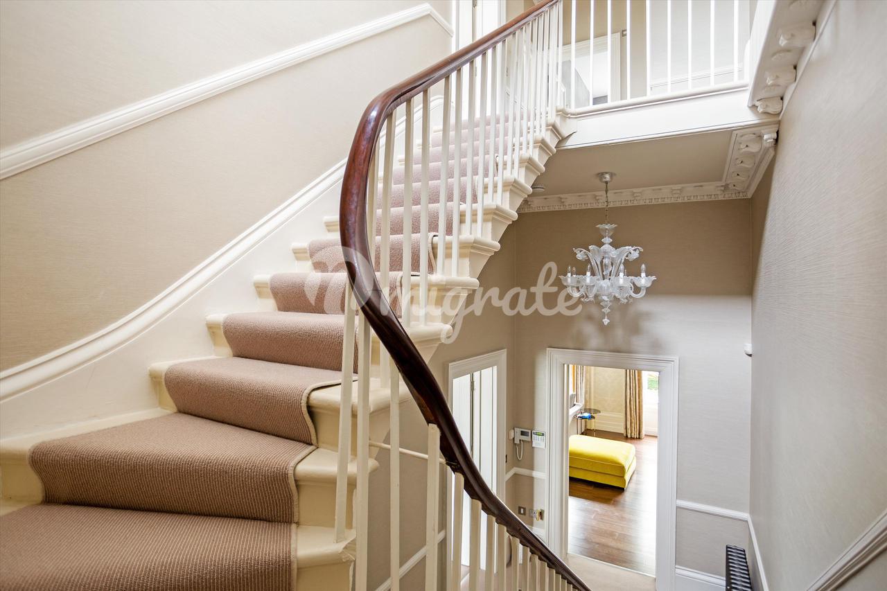 На приподнятом уровне первого этажа великолепный зал для приемов имеет каменную лестницу, поднимающуюся на верхние этажи, и ведет в двойную приемную, разделенную двойными дверями на парламентских петлях. Задняя часть этих двух комнат открывается в новую пристройку, где поразительная «стеклянная стена» обеспечивает приподнятый вид на сад и невероятное количество света. Кабинет расположен в этом пространстве и имеет раздвижную дверь во всю длину на балкон. В прилегающем вестибюле есть стеклянная лестница, ведущая на нижний этаж.