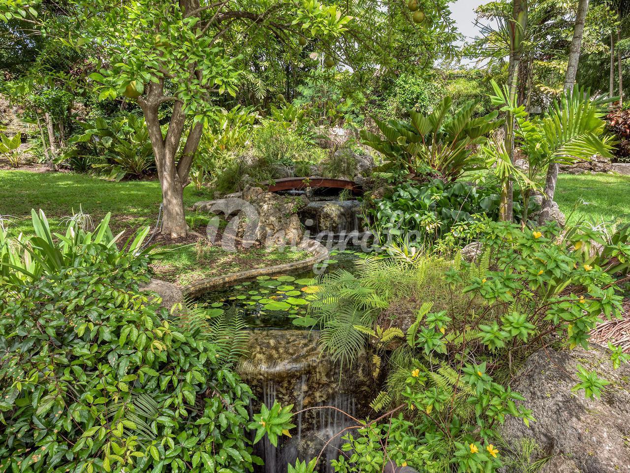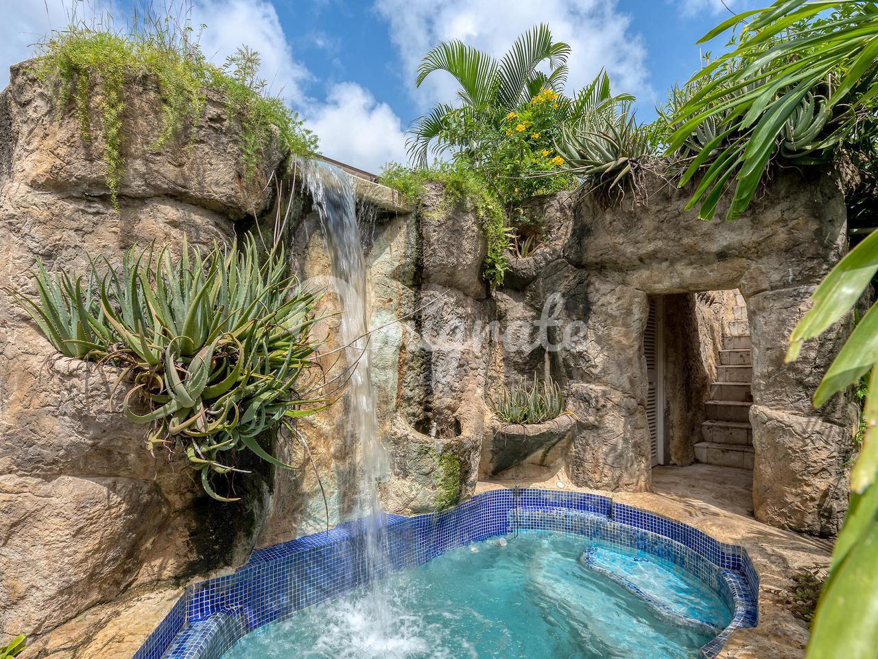 Здесь есть большой пейзажный бассейн с подогревом, который каскадом спускается через водопад к небольшому бассейну и секретной пещере внизу. Существует также большая терраса / настил с беседкой у бассейна и большой обеденной зоной.