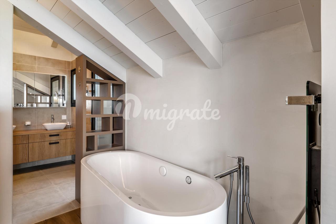 Недвижимость состоит из трех этажей, включая главный вход на первом этаже, жилые помещения открытой планировки с кухней, столовой и гостиной, все с выходом на террасу. На этом уровне также находится главная спальня с гардеробной, ванной комнатой и отдельным выходом на террасу с джакузи.
