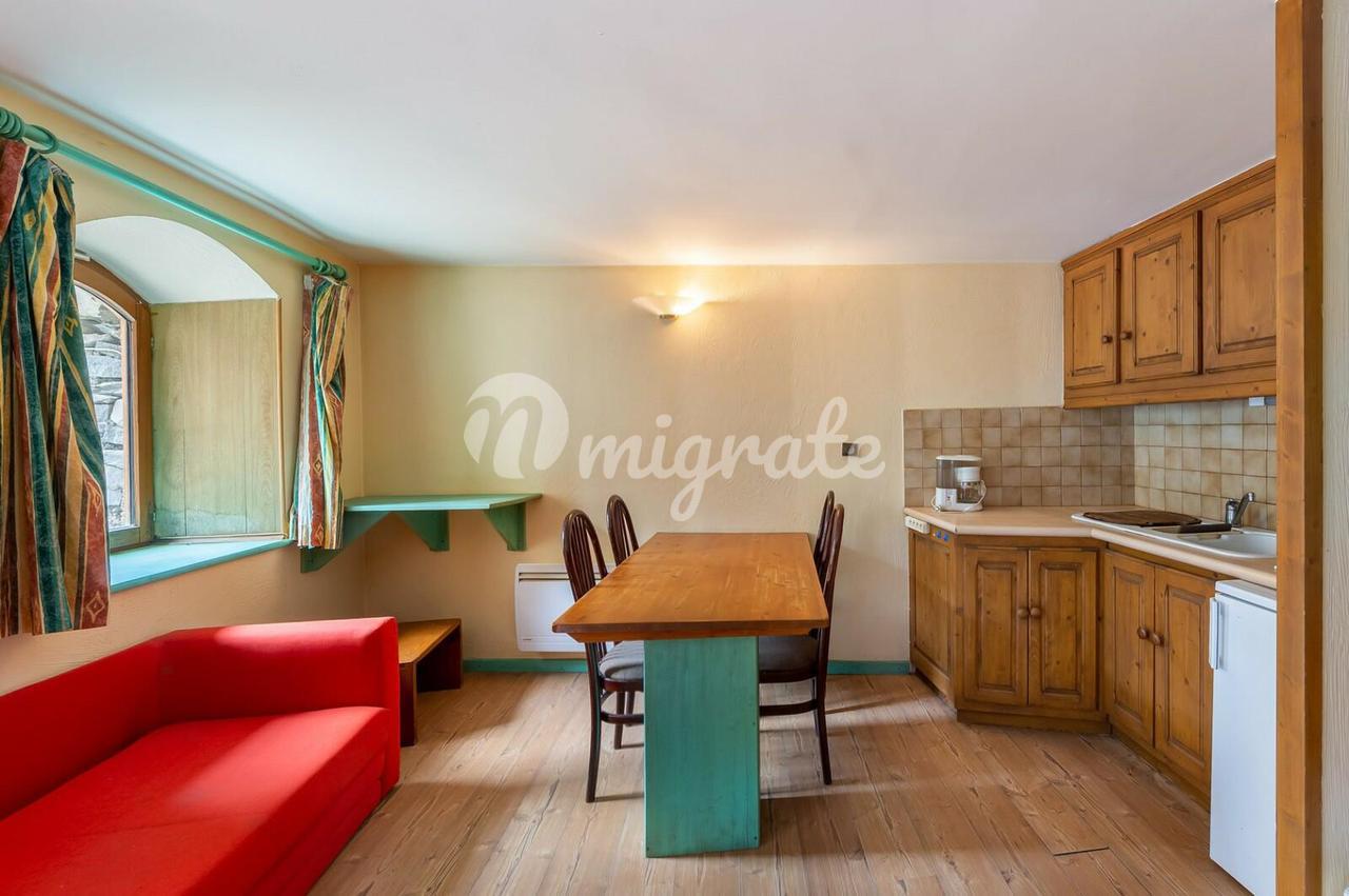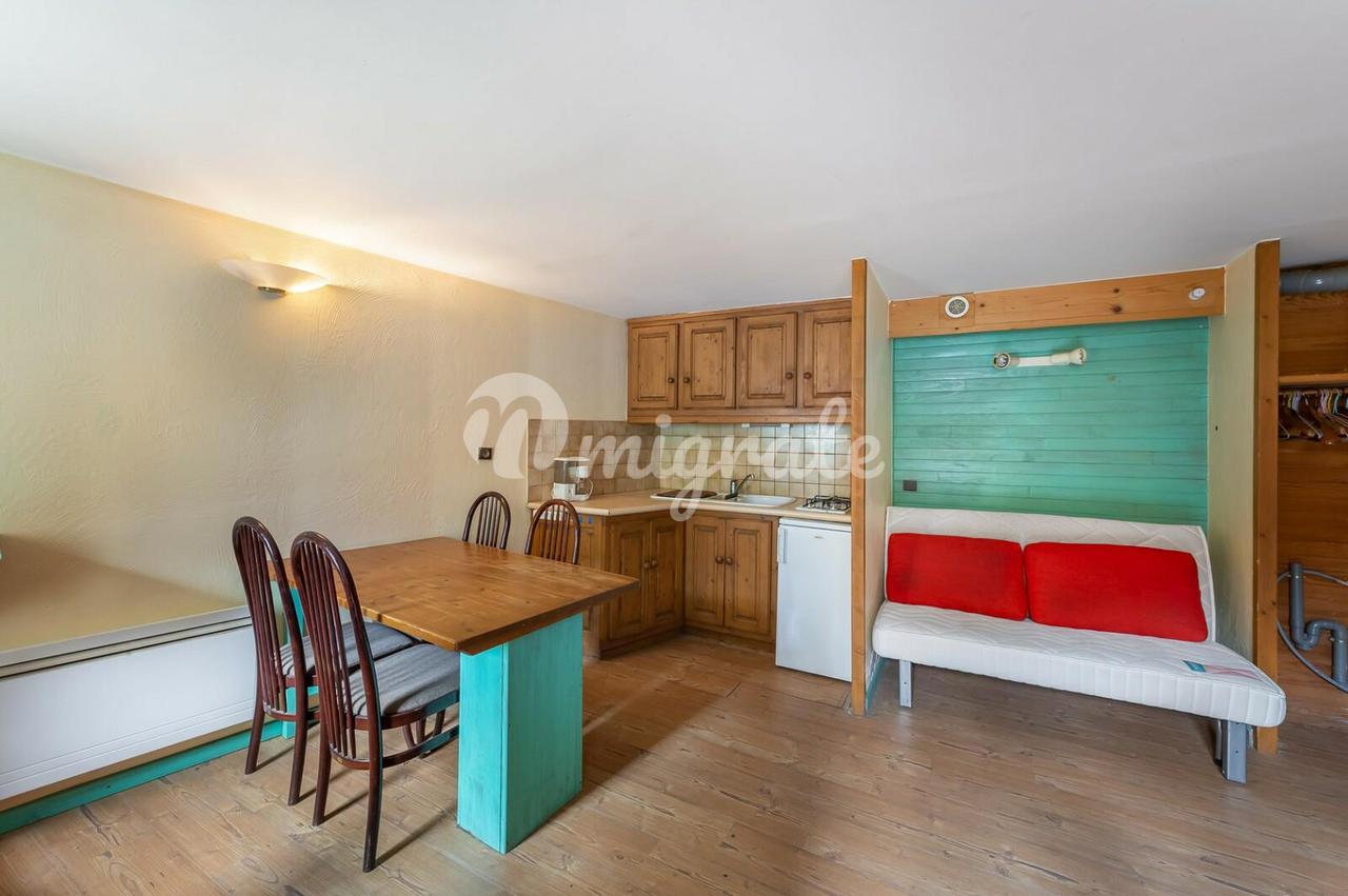 Шале разделено на две независимые части. Одна из них, на первом этаже, оборудована как студия площадью 22,73 кв.м и включает в себя кухню, выходящую в гостиную с видом на горы, и ванную комнату.