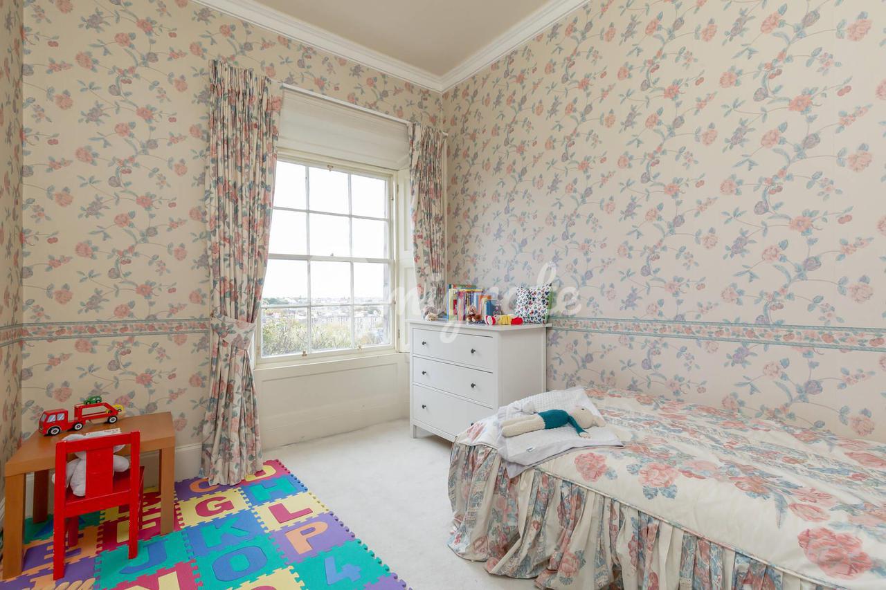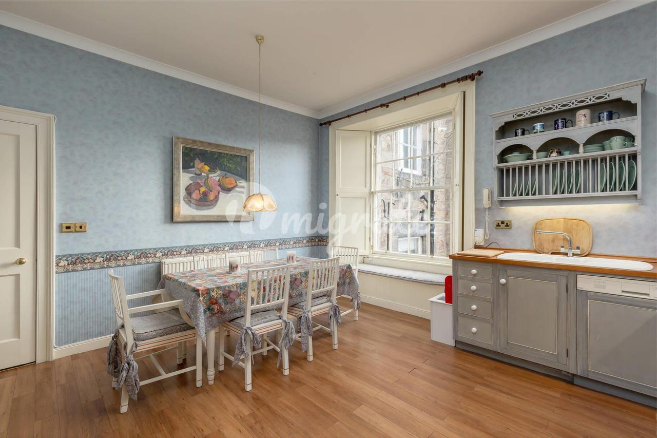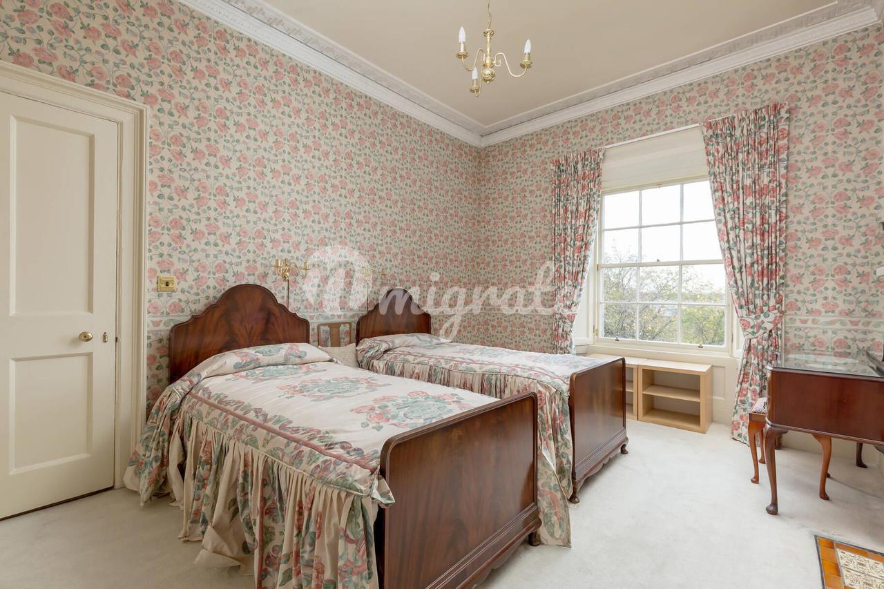 Главная спальня с видом на Скотленд-стрит располагает собственной душевой комнатой. Есть еще две спальни с двуспальными кроватями и семейная ванная комната. Кроме того, под тротуаром есть подвал, куда можно попасть из подвального помещения. Это сказочный отель, удобно расположенный в тихом, но центральном месте. Есть возможности для некоторой модернизации, и квартира предлагает кому-то возможность создать уникальную квартиру в центре города.