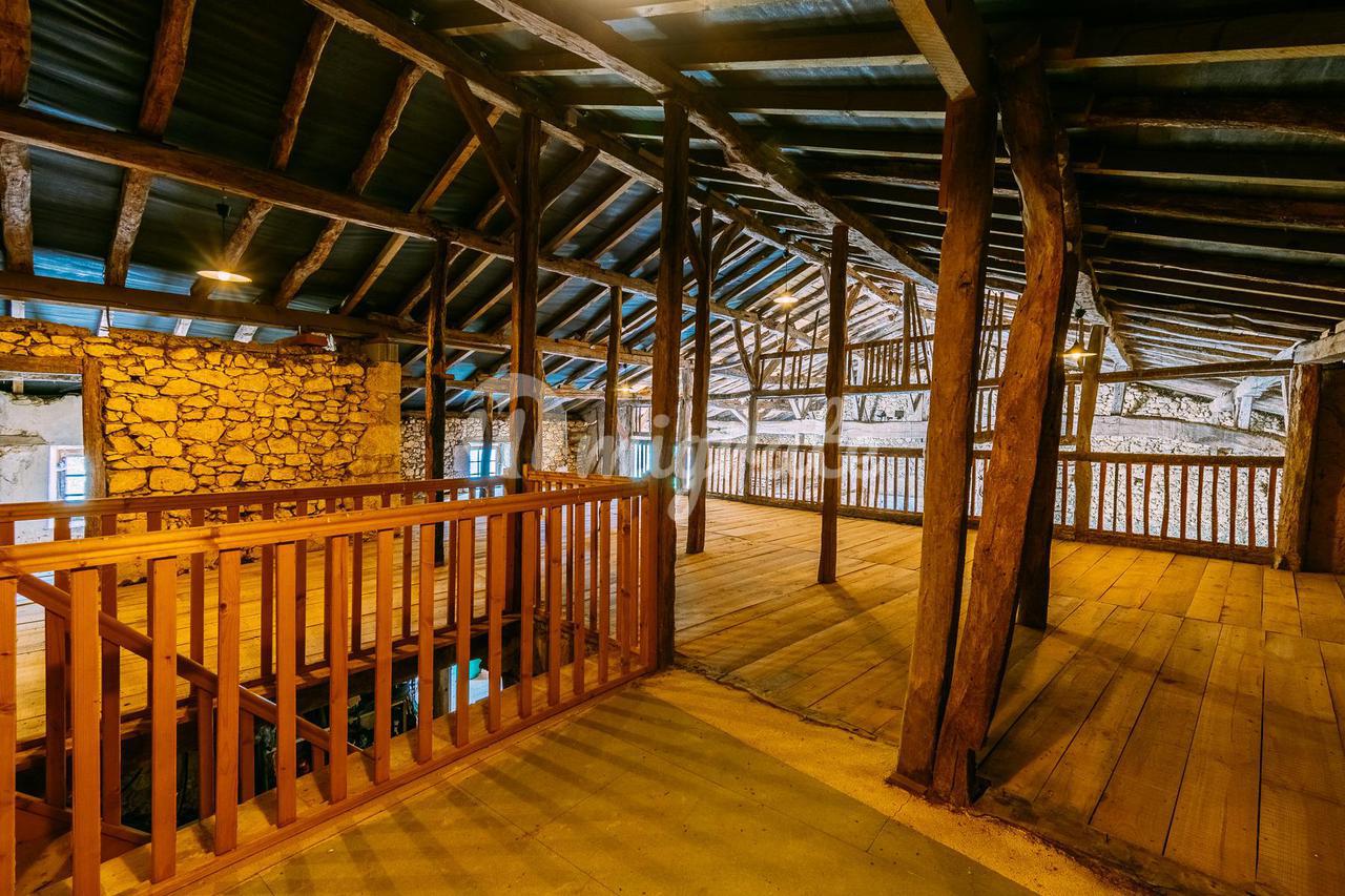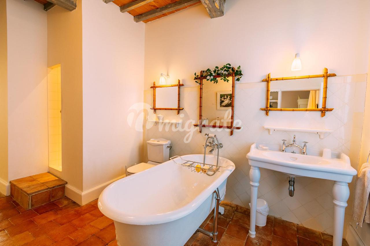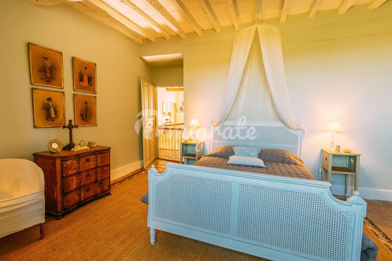На первом этаже - прихожая, небольшой салон с камином, спальня с ванной комнатой, столовая с французскими окнами в сад, кухня, подсобное помещение и большой салон площадью 110 кв.м с балочными потолками. , старинный камин и старинные элементы.