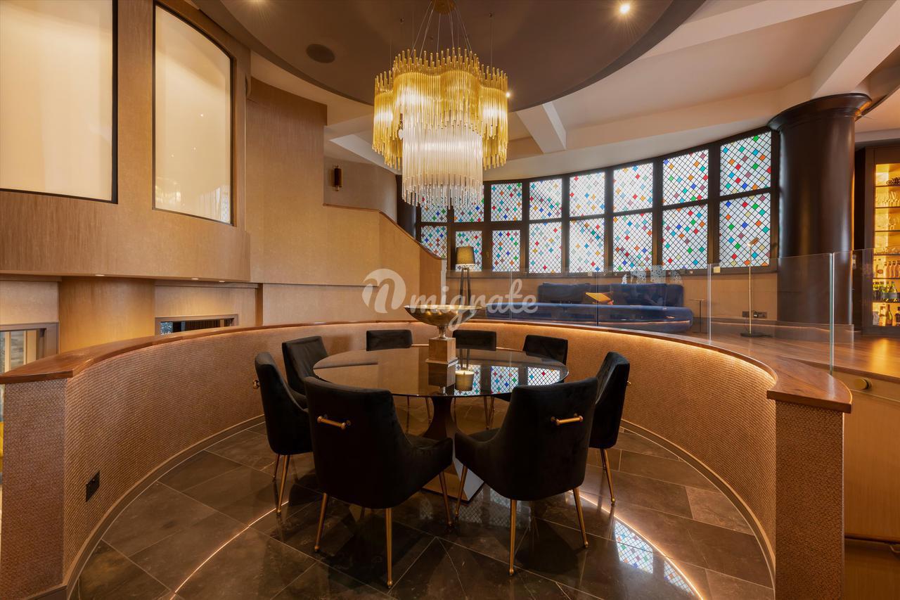 На этом уровне также есть отдельная круглая платформа, на которой расположена официальная обеденная зона с достаточным пространством для подвесной люстры наверху, и это пространство дополнительно расширено стеной из красивых витражей, выполненных Chiswick Stain Glass, создателями культовых окон в The Ivy.