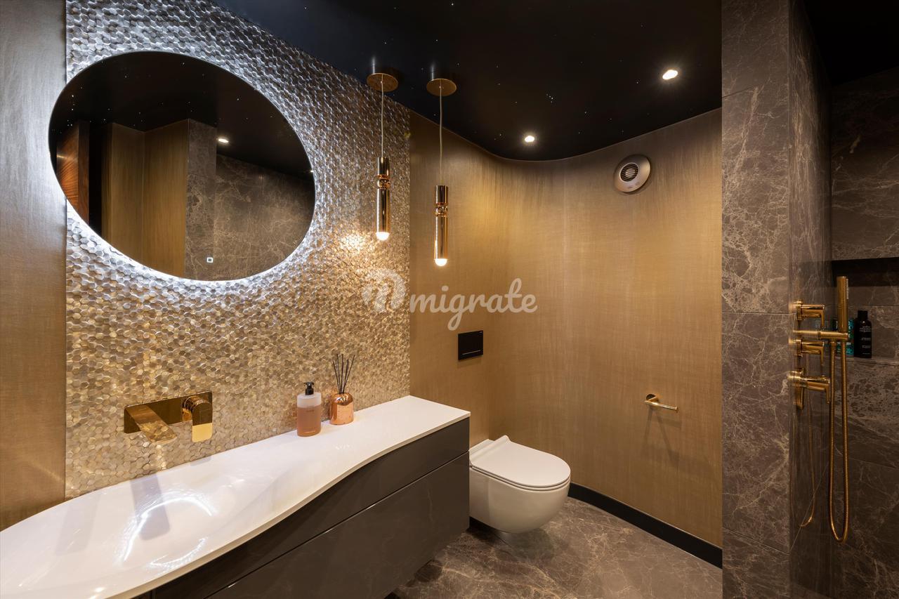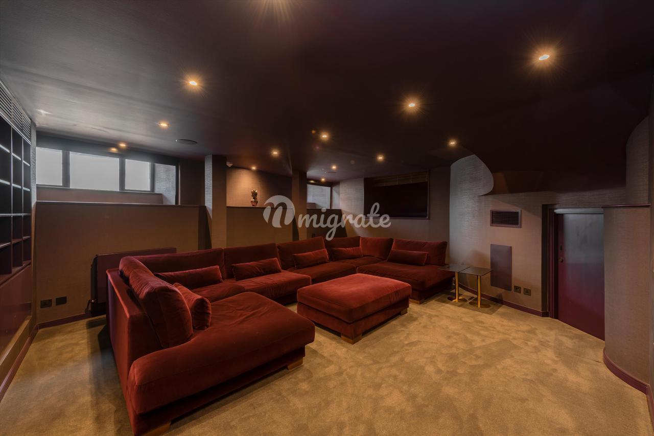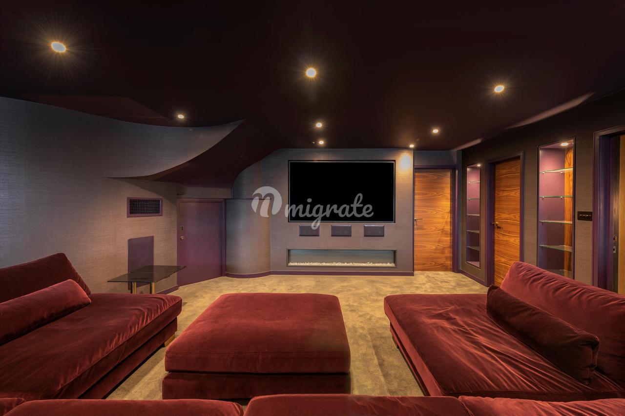 Наконец, нижний уровень может похвастаться впечатляющим 10-местным кинозалом, который идеально подходит как для семейного проживания, так и для развлечений, а также собственной ванной комнатой, позволяющей при необходимости использовать это пространство в качестве четвертой спальни.