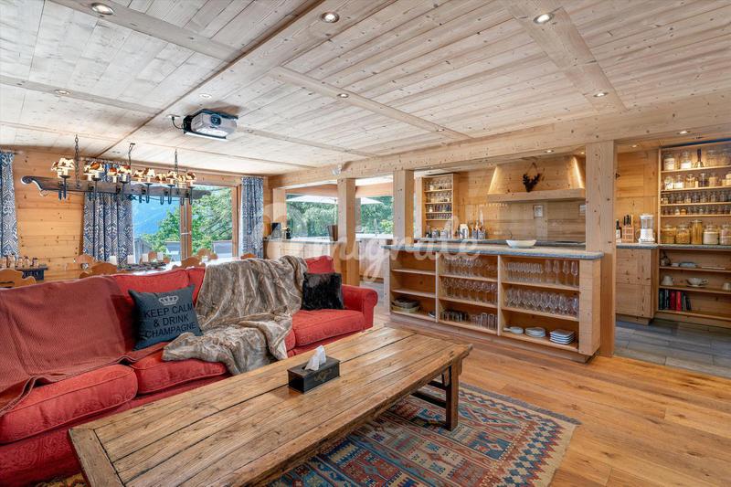 В шале есть главная гостиная на первом этаже с огромной открытой планировкой площадью 166 м², включающая современную кухню, открытый камин и выделенную гостиную, столовую, ТВ и бар. На этом этаже такж