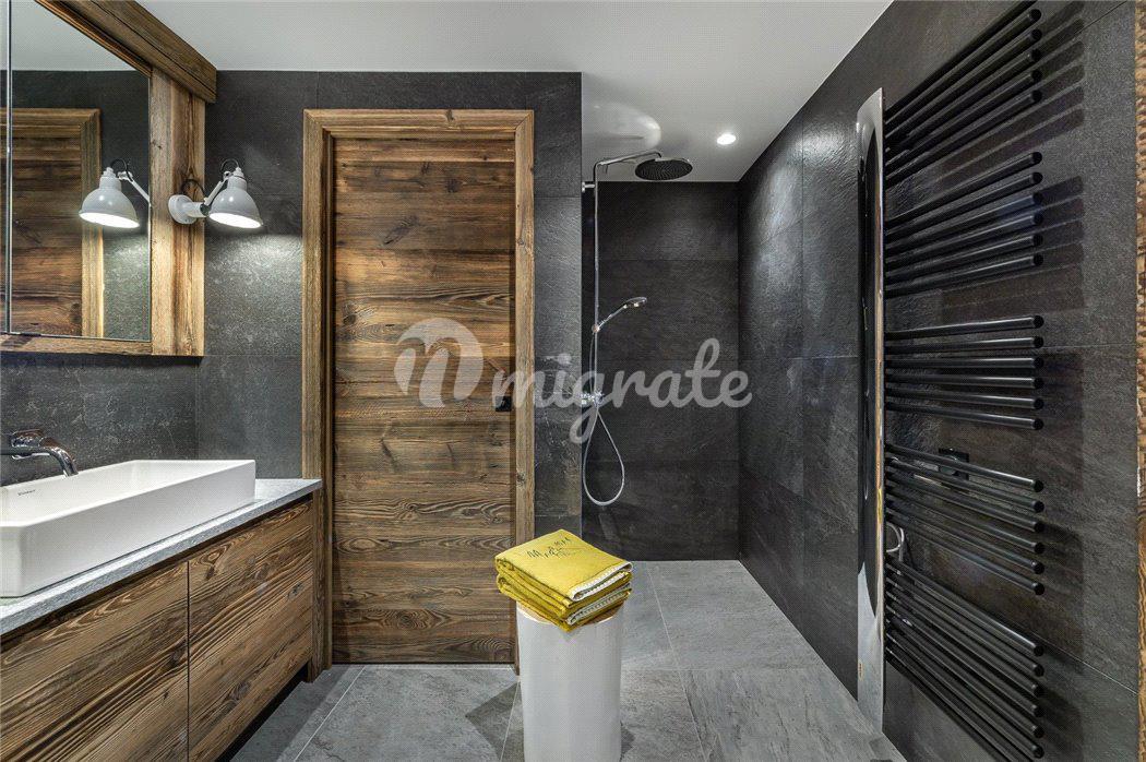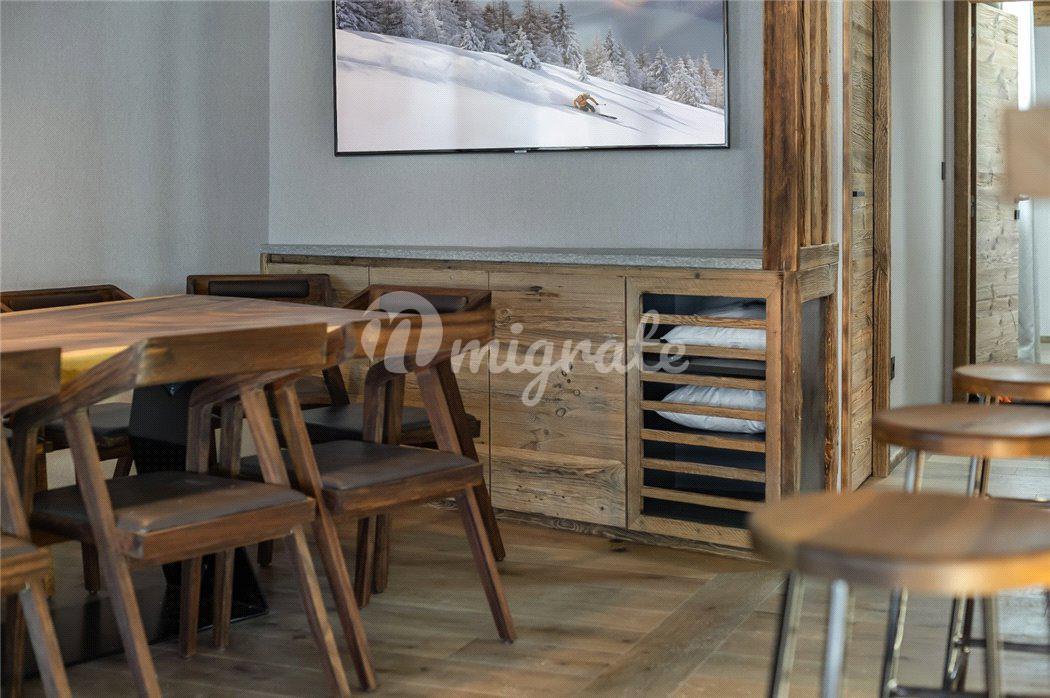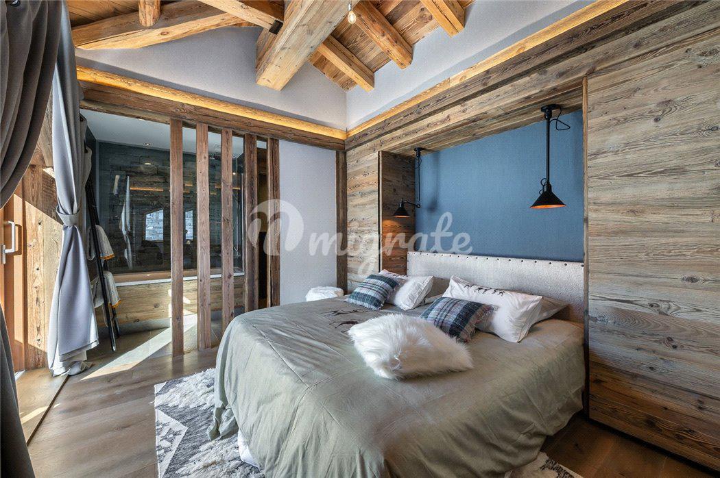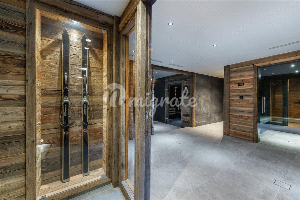 Шале состоит из просторной гостиной в альпийском стиле, полностью оснащенной кухни открытого плана, столовой с камином, 5 спален, 5 ванных комнат, спа-зоны с сауной, хаммамом, массажной комнатой и игровой.