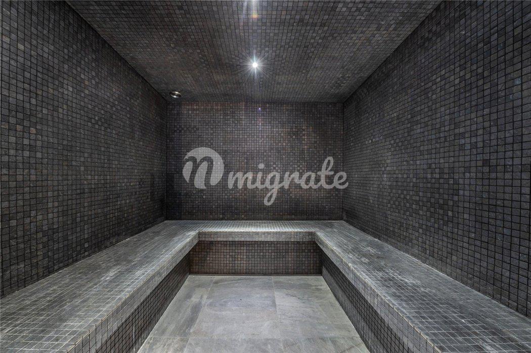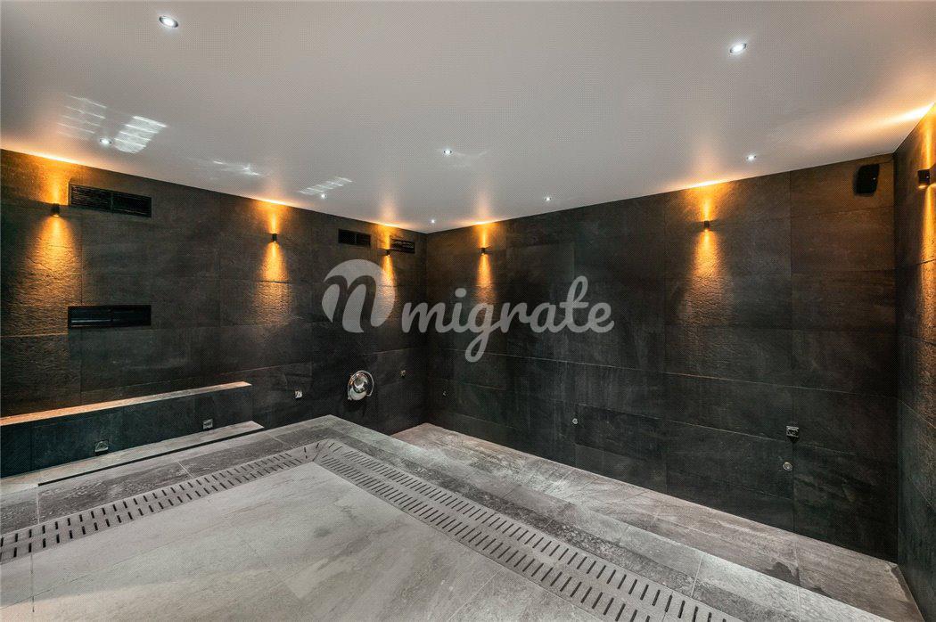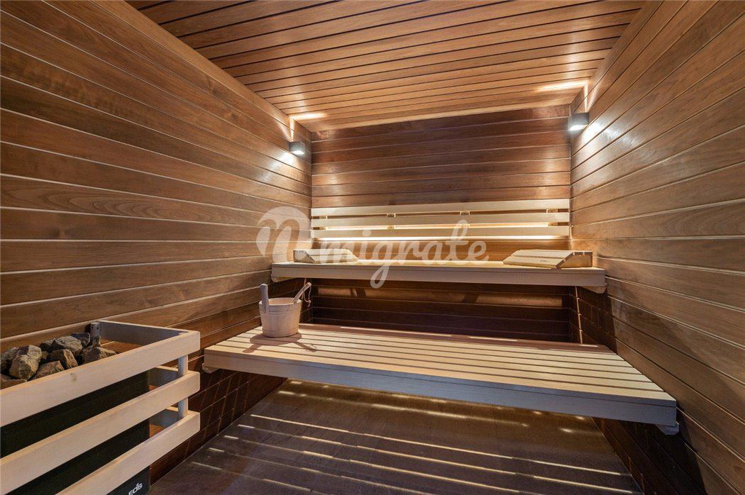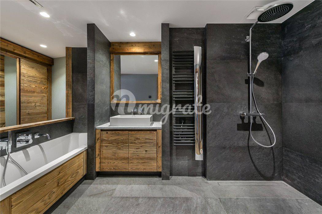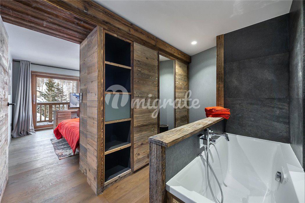 Шале состоит из просторной гостиной в альпийском стиле, полностью оснащенной кухни открытого плана, столовой с камином, 5 спален, 5 ванных комнат, спа-зоны с сауной, хаммамом, массажной комнатой и игровой.