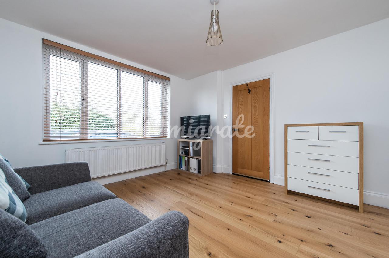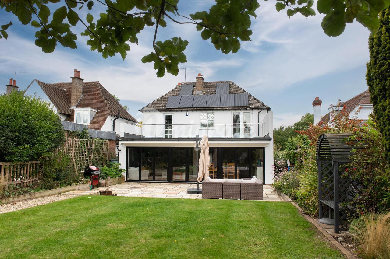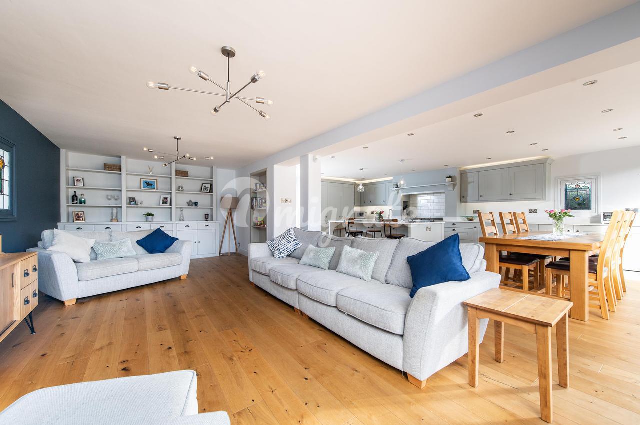 Впечатляющая кухня / столовая / гостиная открытой планировки с дизайнерским дубовым полом с электрическим подогревом, встроенным шкафом для напитков и тремя комплектами двустворчатых дверей. Здесь есть место для большого обеденного стола, а в просторной гостиной зоне есть встроенные книжные полки и место для хранения вещей внизу. Красивая кухня, изготовленная на заказ Беном Триндером, оснащена большим центральным островом, кварцевыми столешницами и встроенной бытовой техникой, включая винный холодильник, полноразмерный холодильник с морозильной камерой, двойную духовку Everhot с конфоркой и индукционной плитой, а также посудомоечную машину Bosch. Рядом с кухней находится подсобный шкаф и выход во встроенный гараж.