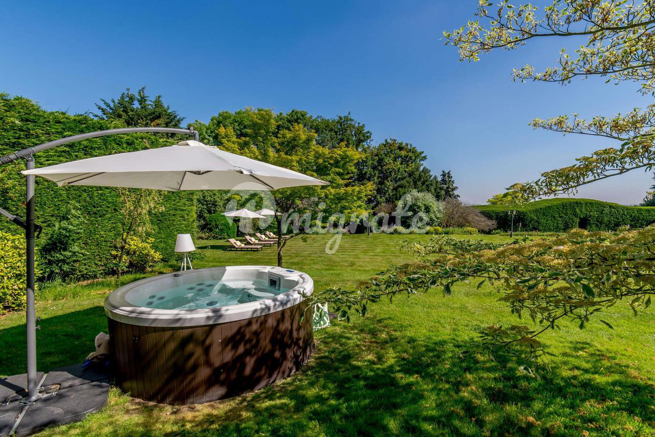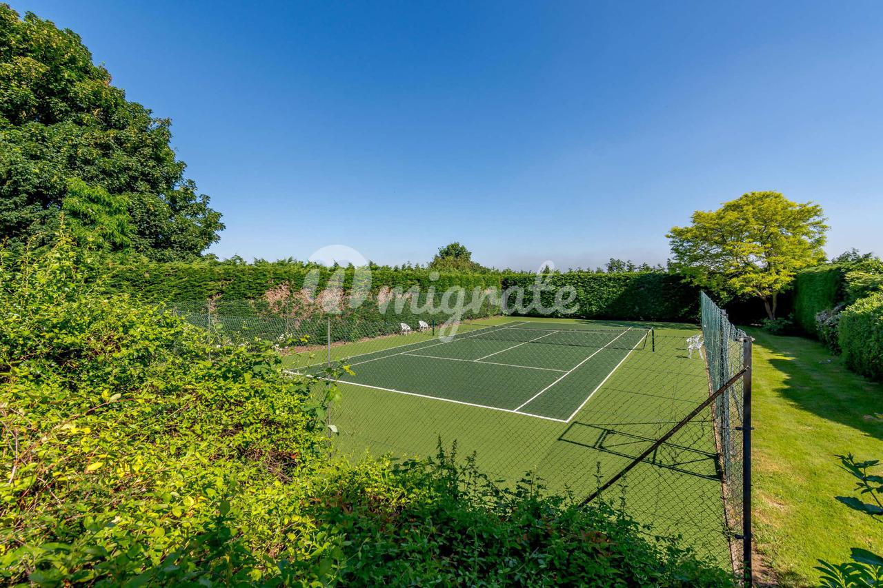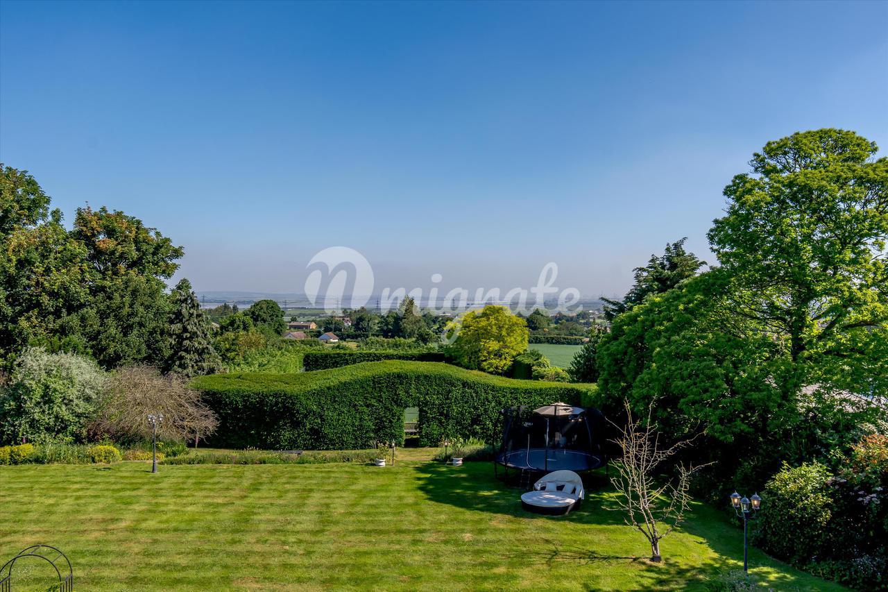Доступ к собственности осуществляется через электрические ворота, ведущие к большому кругу поворота на восток и к передней части собственности, окруженной ухоженными газонами и вечнозелеными изгородями. Непосредственно к южной стороне дома расположен гараж, а на кольцевой развязке есть место для дополнительной парковки. Основные сады расположены к северу и западу от дома, а теннисный корт скрыт за зрелой живой изгородью. В садах также есть джакузи, они в основном уложены на лужайке и окружены несколькими взрослыми деревьями, что обеспечивает высокую степень уединения. Высажены обширные травянистые бордюры, деревья, кустарники и живые изгороди. Есть несколько дорожек и ступенек, обеспечивающих доступ к садам с большой каменной террасы Йорка. Сады являются прекрасной особенностью отеля и вместе с видом на Темзу создают восхитительное ощущение пространства, идеально подходящего для развлечений и отдыха. Во всех садах и участках простираются примерно на 1,2 акра.