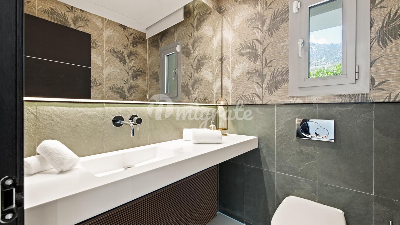 Планировка первого этажа предлагает прихожую, ведущую прямо в гостиную с камином, столовую, полностью оборудованную кухню открытой планировки с техникой высшего класса и прилегающей прачечной, гостевой туалет и спальню с ванной комнатой. ванная комната. Терраса, окружающая виллу, соединяет все комнаты и имеет пейзажный бассейн с видом на море.