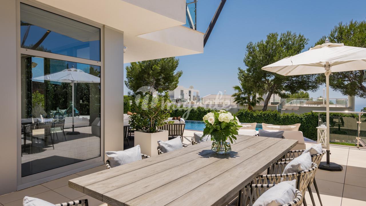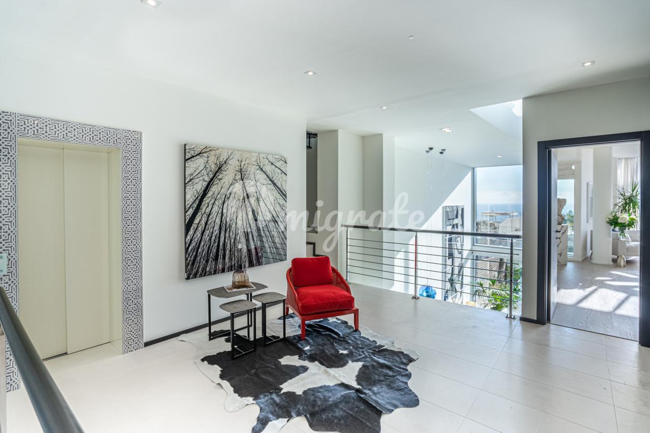 Лифт ведет на второй этаж, где расположены еще две спальни. В гостевой спальне есть встроенные шкафы, ванная комната с очень большой душевой кабиной и две террасы, а в главной спальне есть терраса на юго-восточной стороне с видом на море, а также двойная раковина, гидромассажная ванна и душ в ванной комнате. .