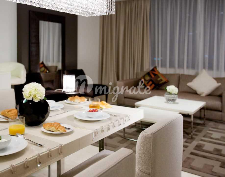 Эта просторная квартира с одной спальней имеет прихожую, гостевой санузел, гостиную, спальню с двуспальной кроватью, гардеробной и ванную комнату.