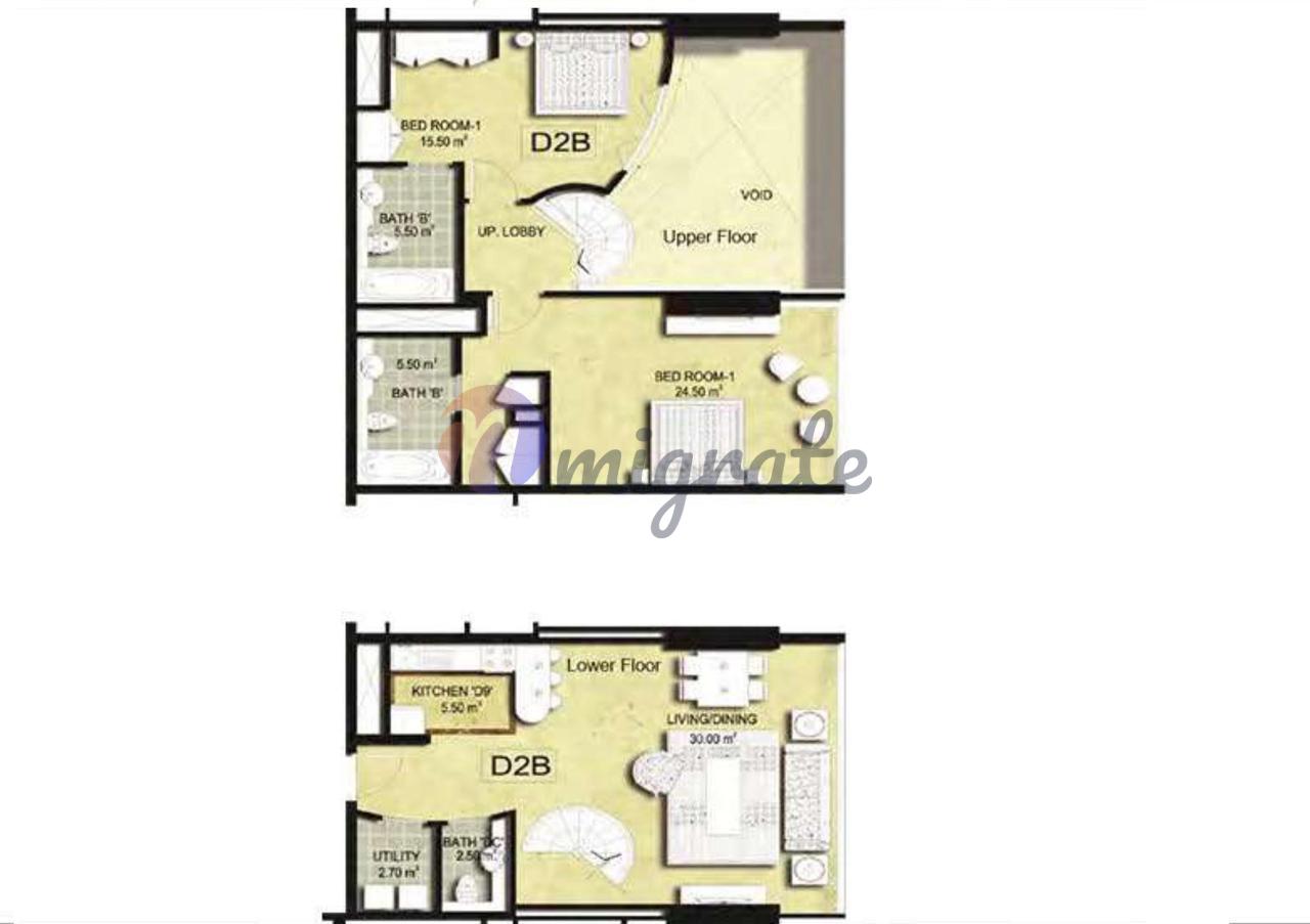 Эта просторная квартира с двумя спальнями имеет прихожую, гостевой санузел, гостиную, спальни с двуспальной кроватью, гардеробной и ванную комнату.