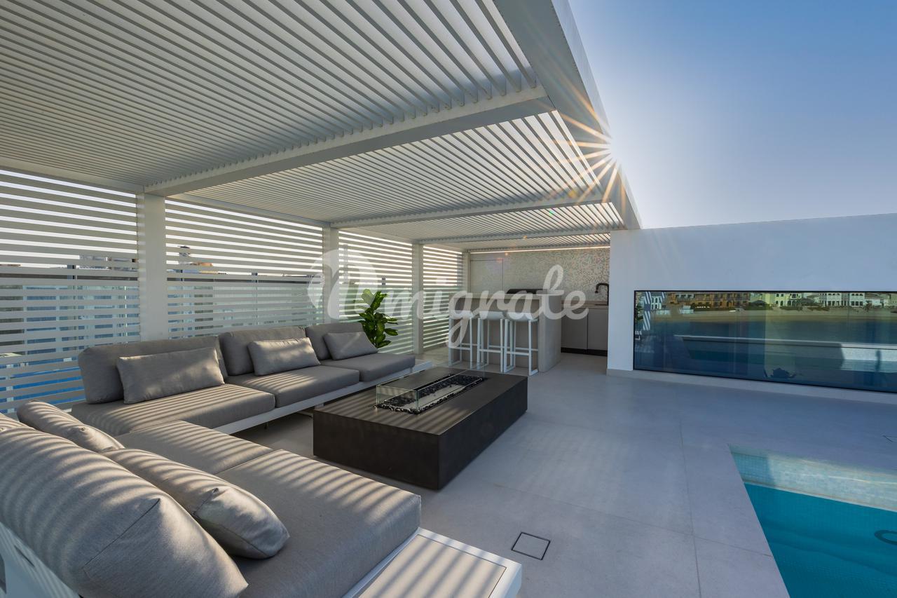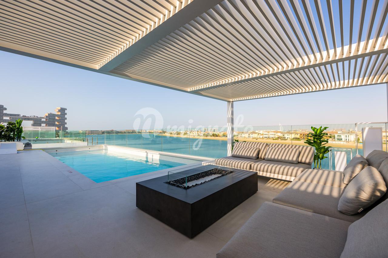 На территории виллы расположен большой сад, ведущий к пляжу, а изюминкой виллы является терраса на крыше с большим бассейном, зоной отдыха и полностью оборудованной кухней на открытом воздухе. Отсюда открывается вид на знаковые достопримечательности Дубая, в том числе на отель Atlantis и марину Дубая.