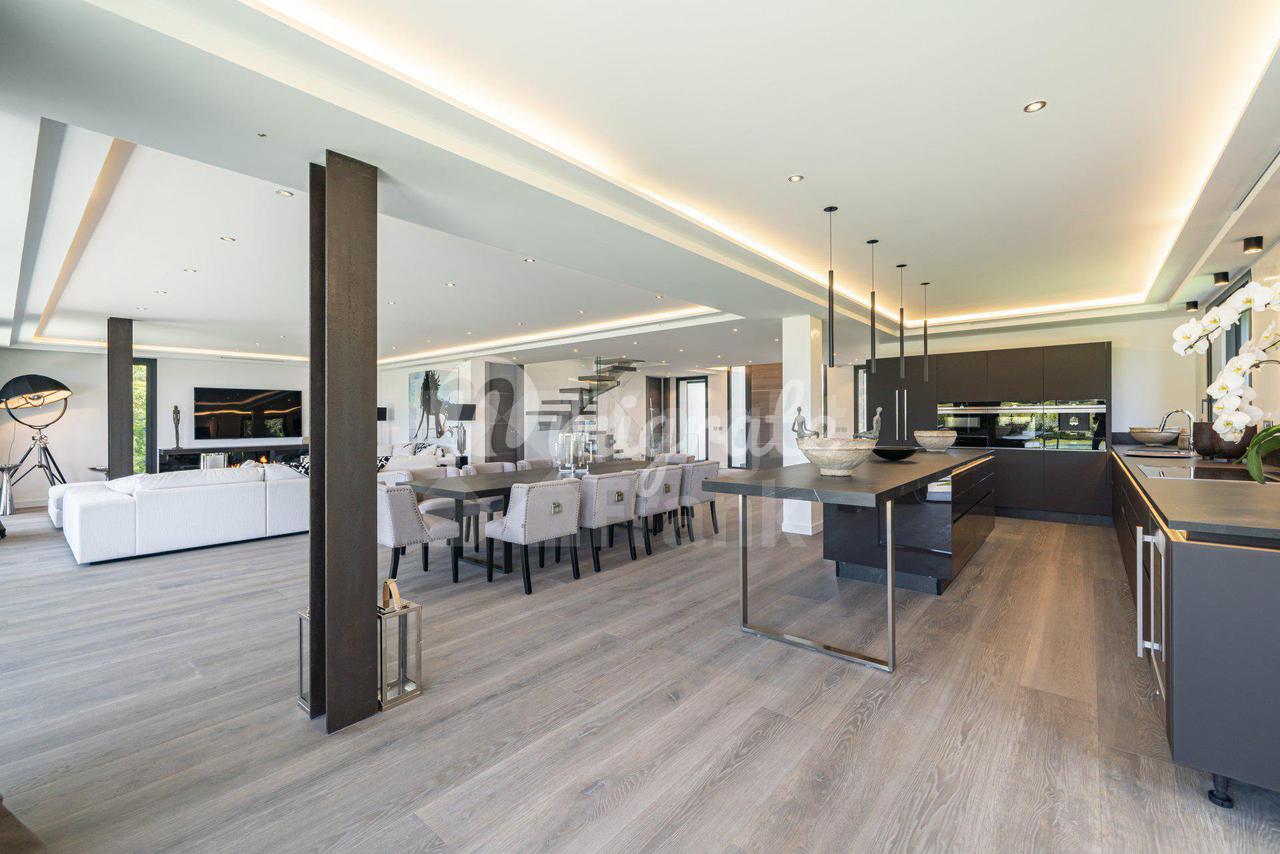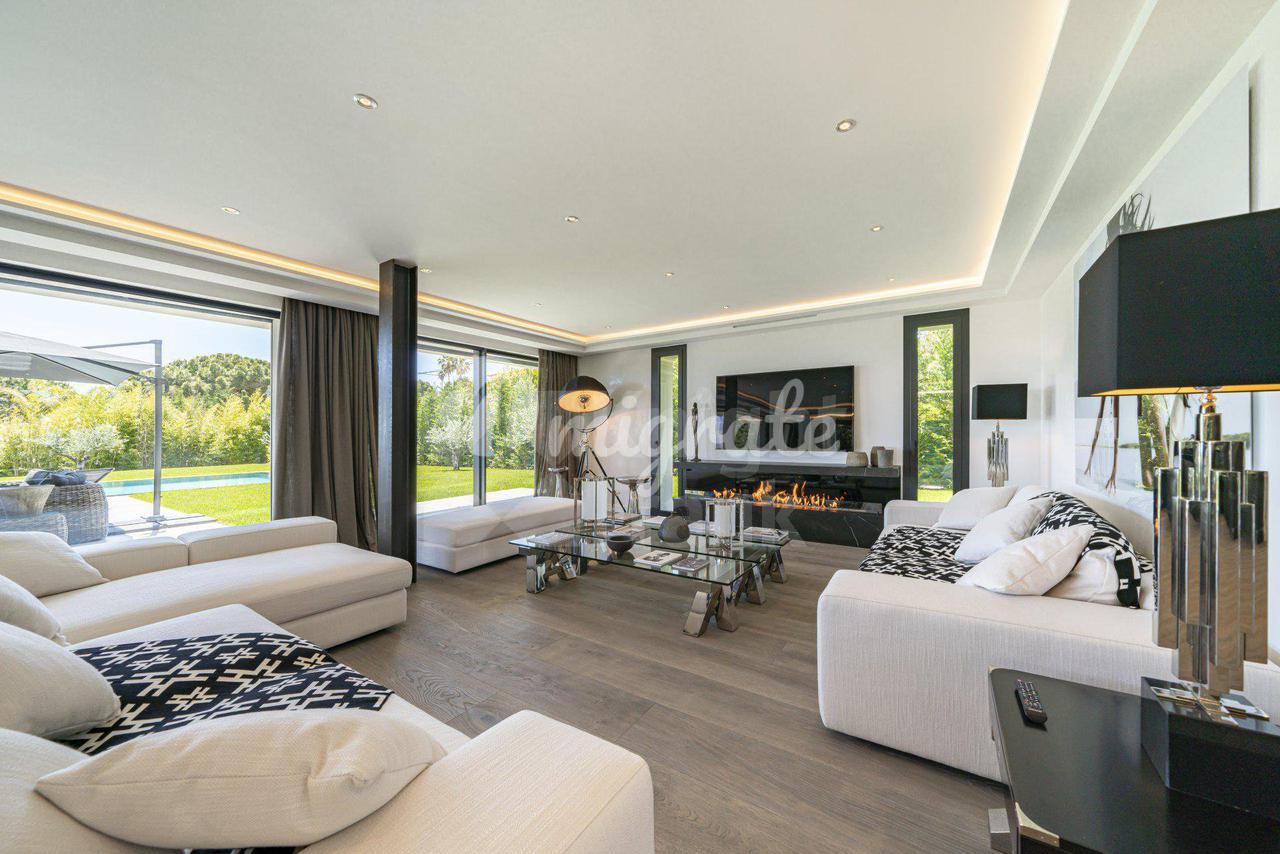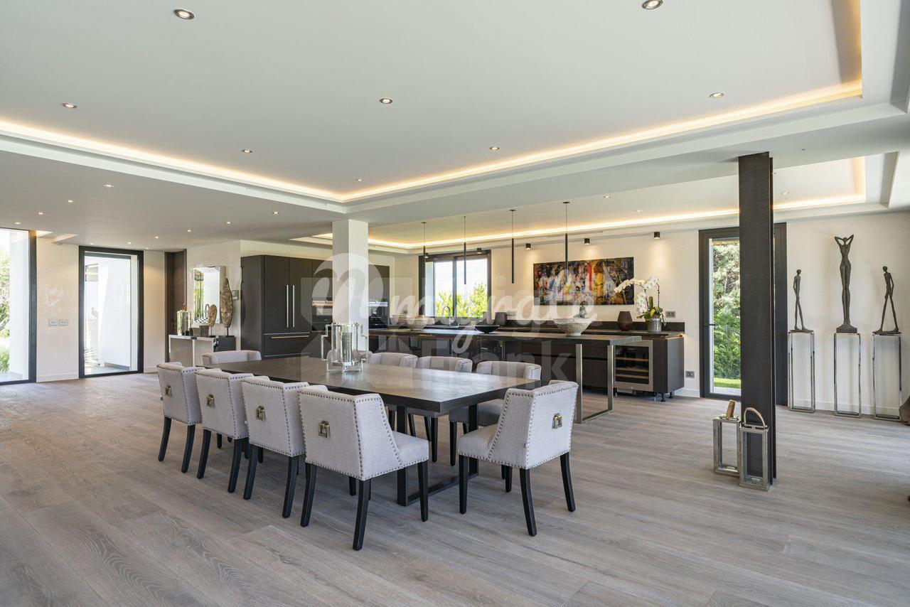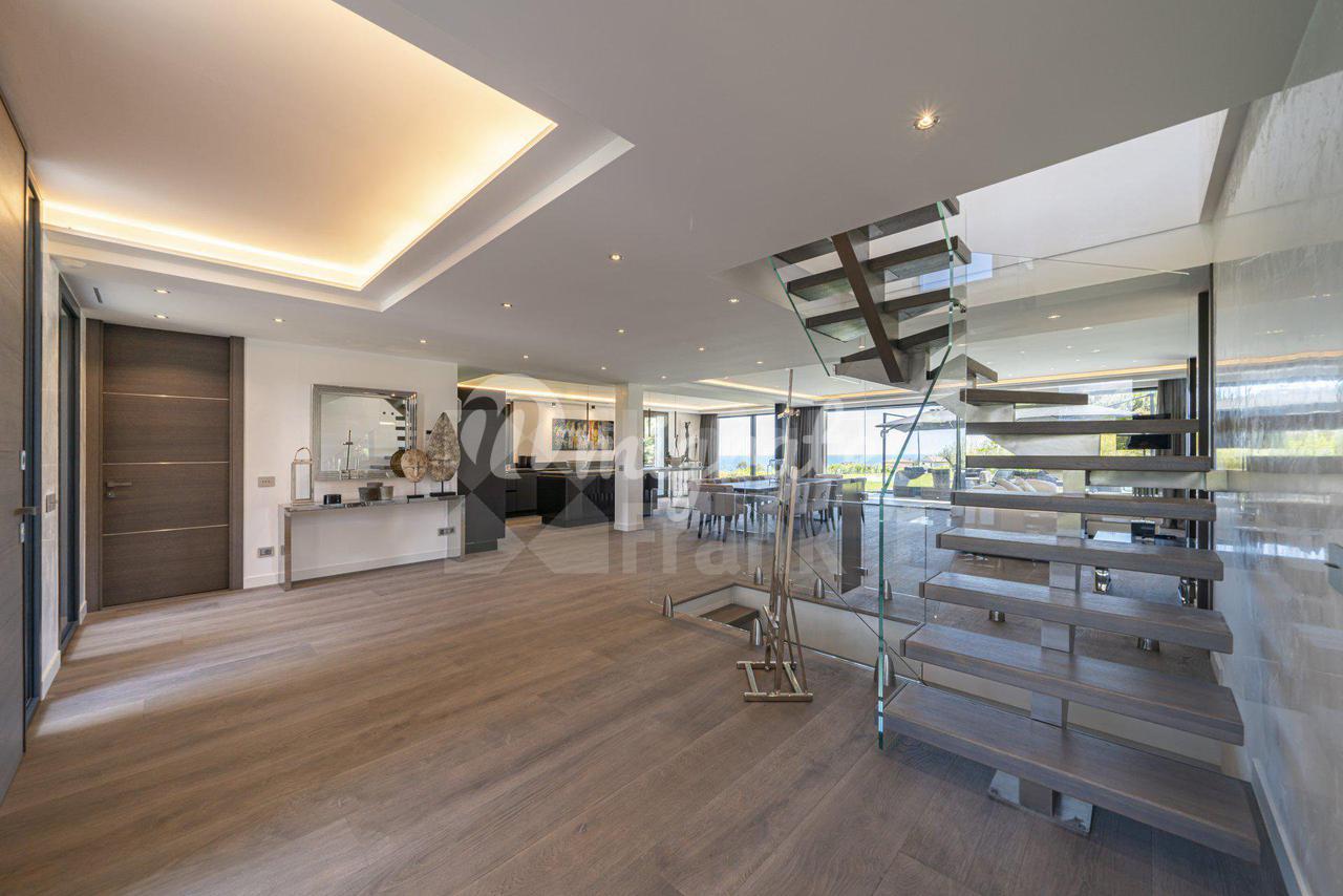 Роскошная современная вилла расположена в престижном районе в Каннах, на ландшафтном участке площадью 2 400 кв. м с бассейном и панорамными видами на море. Вилла включает прихожую, просторную гостиную с выходом в сад к бассейну, столовую, полностью оснащенную кухню, 5 спален с ванными комнатами и гардеробными, крытый бассейн, домашний кинотеатр, винный погреб и гараж на 2 автомобиля. Техническое оснащение включает уличное освещение, сигнализацию, автоматические ворота.