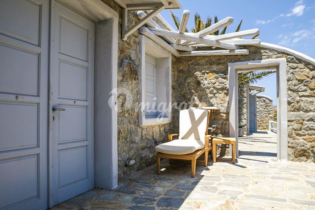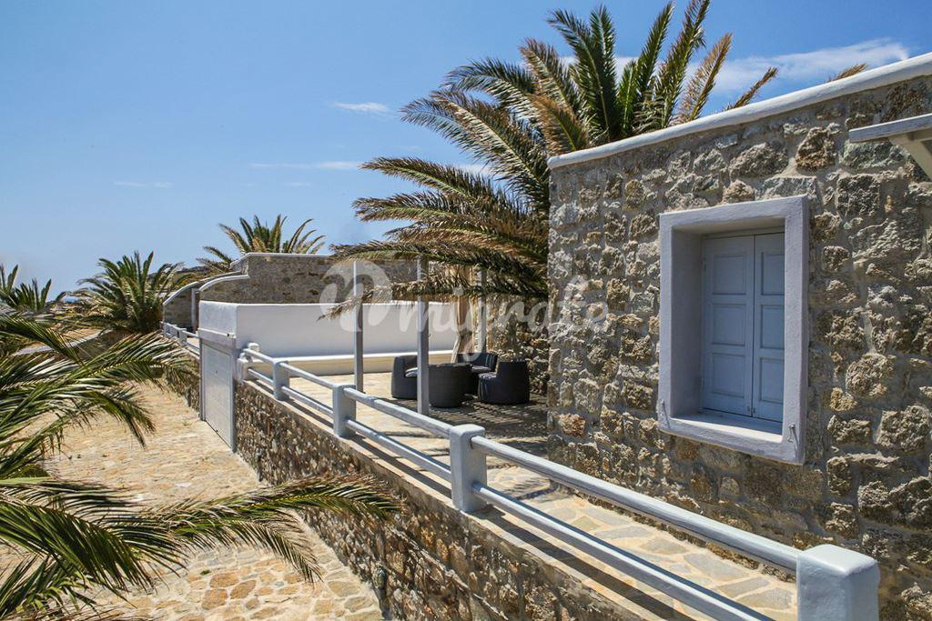 Современная вилла с панорамным видом на Эгейское море расположена на живописном участке, над пляжем Калафатис, где находится множество таверн, баров и водных спортивных центров. Вилла включает 6 спальных и 6 ванных комнат. Вилла вмещает 11 человек. Вилла включает 4 гостевых домика, площадью 30 – 45 кв. м, с собственными ванными комнатами.