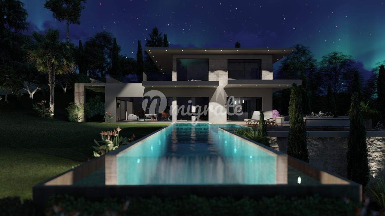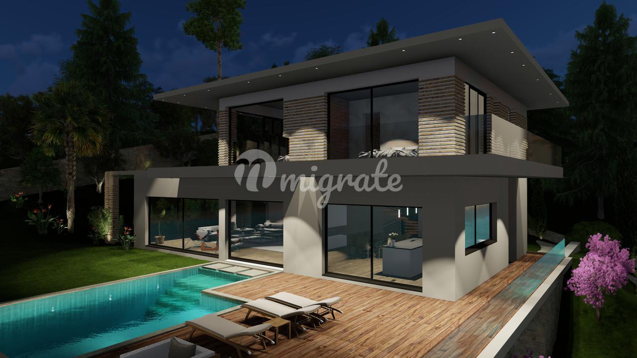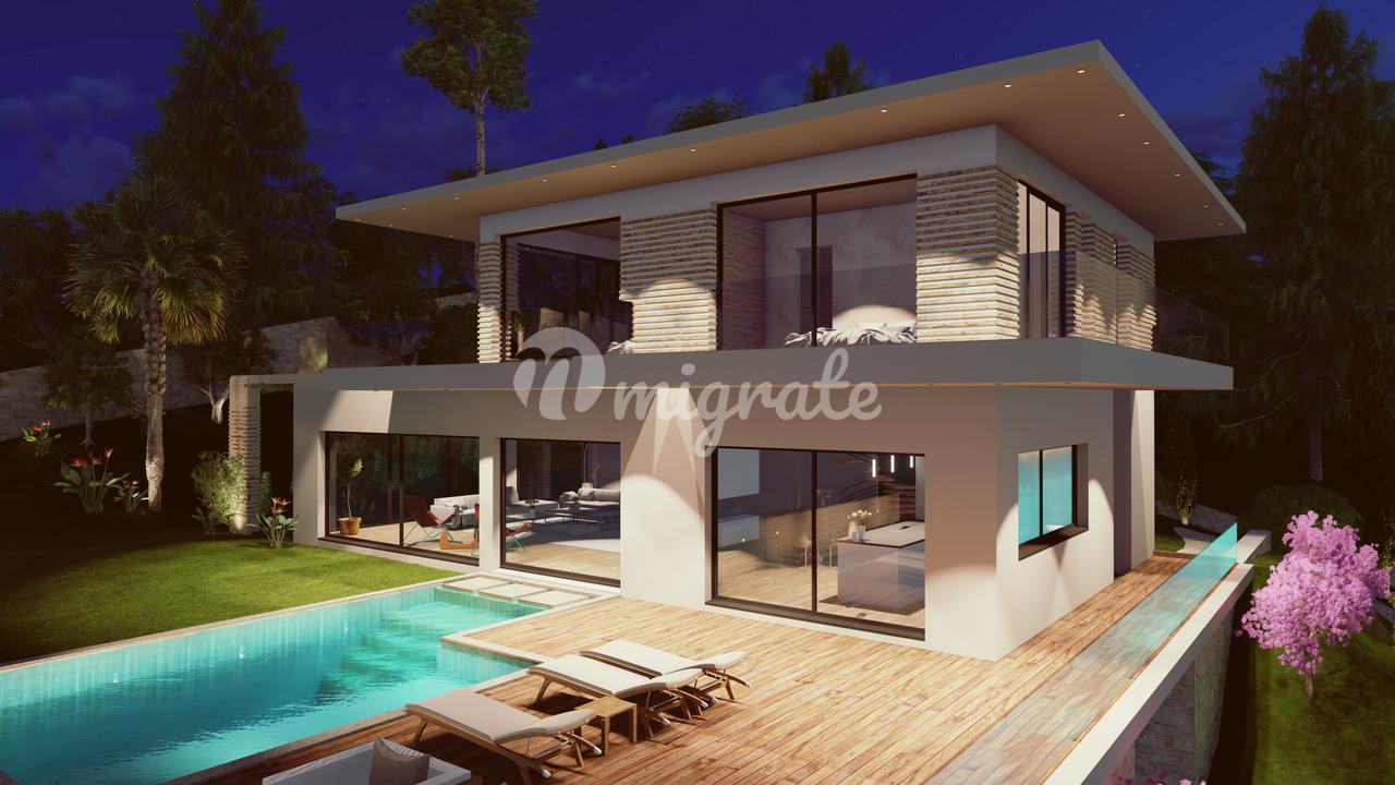 Расположенная на холмах Канн в одном из самых престижных районов города вилла окружена ландшафтным садом площадью 1 850 м² с исключительным видом на залив Кап д'Антиб и Альпы. Вилла предлагает 4 спальни с ванными комнатами и гардеробными, главную спальню с выходом на большую террасу с прекрасным видом на море, просторную гостиную, столовую, кухню, тренажерный зал, хаммам, домашний кинотеатр, винный погреб, прачечную, гараж на 6 машин и бассейн. Установлен лифт, сигнализация, автоматические ворота.