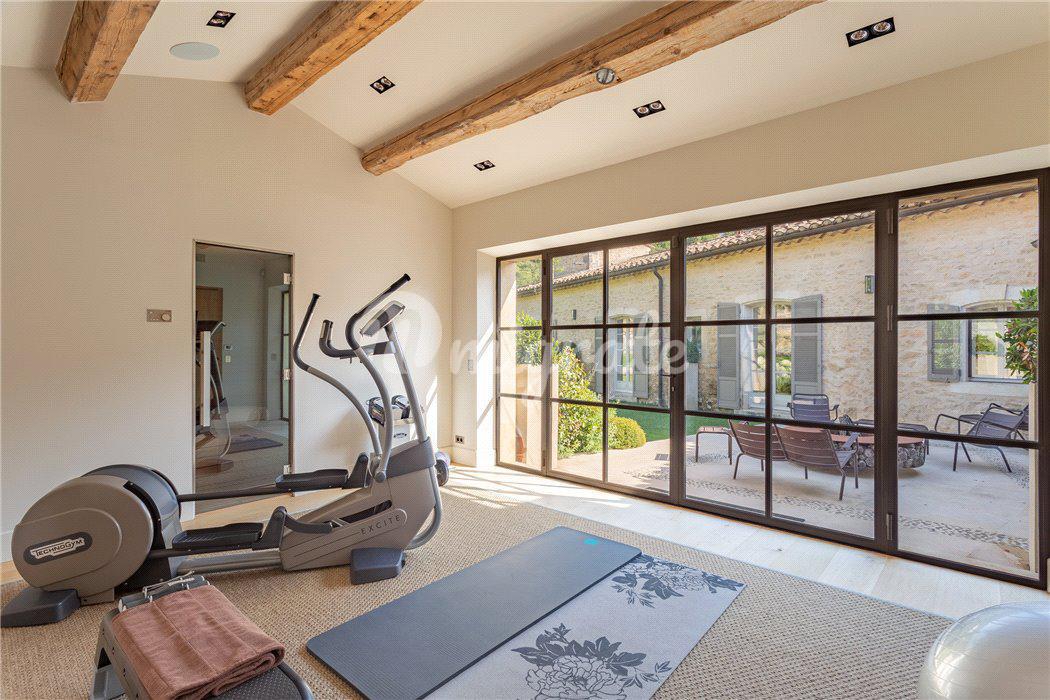 На территории расположен бассейн, домик у бассейна, летняя кухня, тренажерный зал, теннисный корт, сауна, винный погреб, гараж и разбиты оливковые деревья.