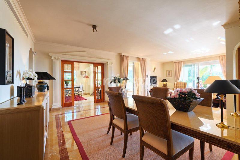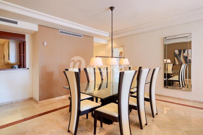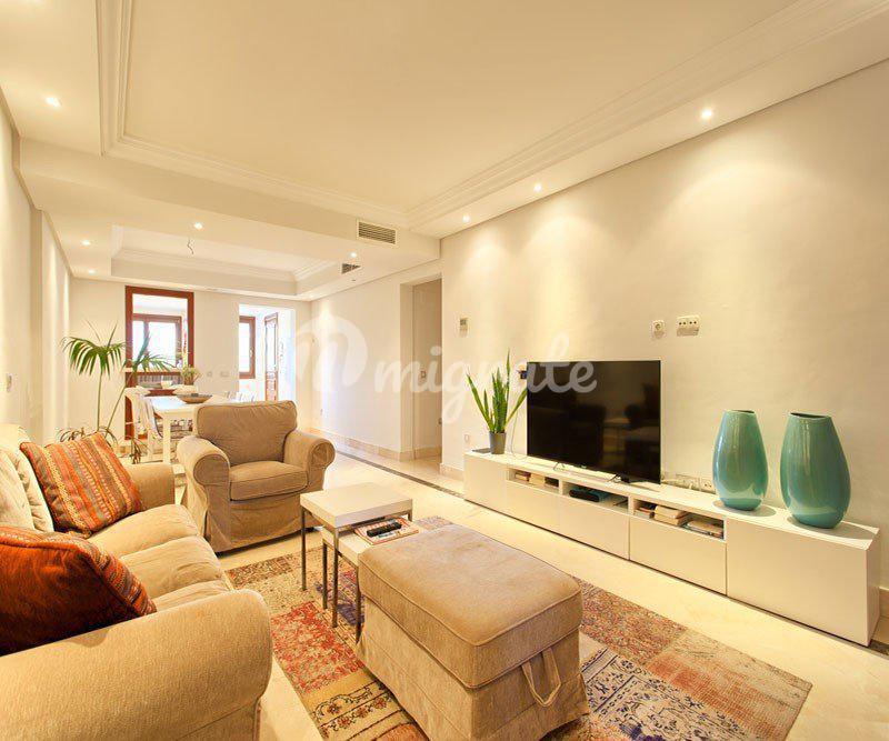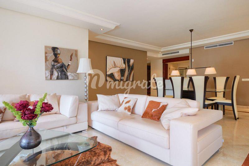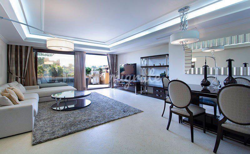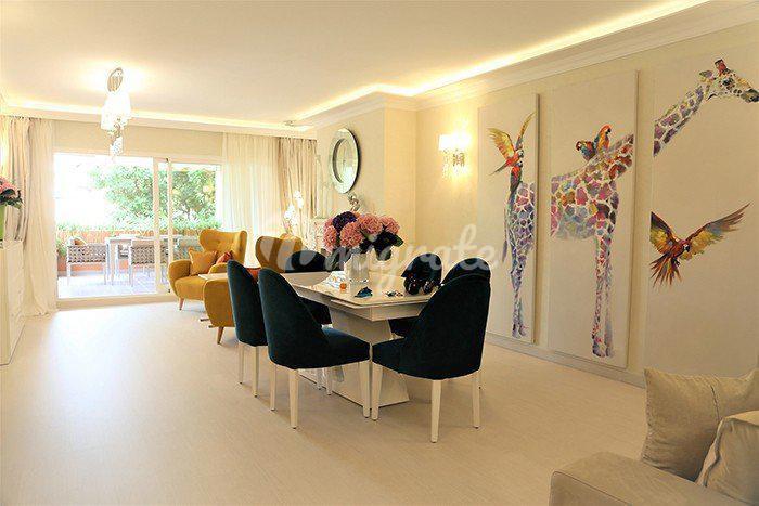 Просторные роскошные апартаменты, расположенные на Золотой Миле, Марбелья. Апартаменты находятся на первом этаже закрытого охраняемого комплекса. Апартаменты располагают: столовой, гостиной с камином