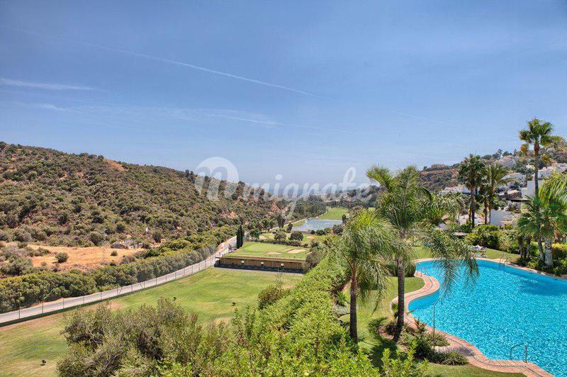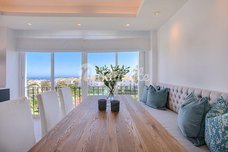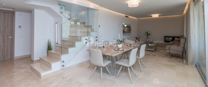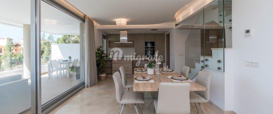 Просторный двухуровневый пентхаус с видами на гольф поле La Quinta, море и горы. Комплекс расположен в районе Ла Кинта города Бенахавис, рядом со всеми удобствами. Первый этаж: большая гостиная и стол