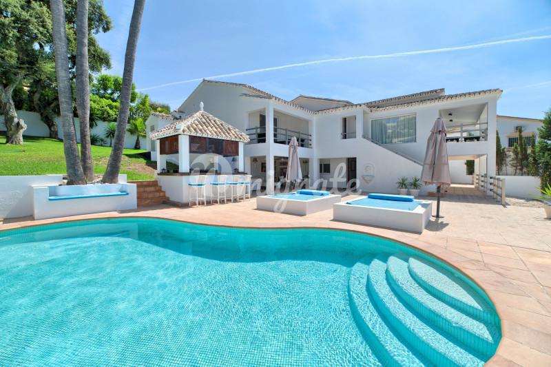 Роскошная 7-спальная вилла, перестроенная в соответствии с новейшими архитектурными тенденциями, расположена на первой линии на побережье (7 км от центра Марбельи). На территории разбит большой сад с