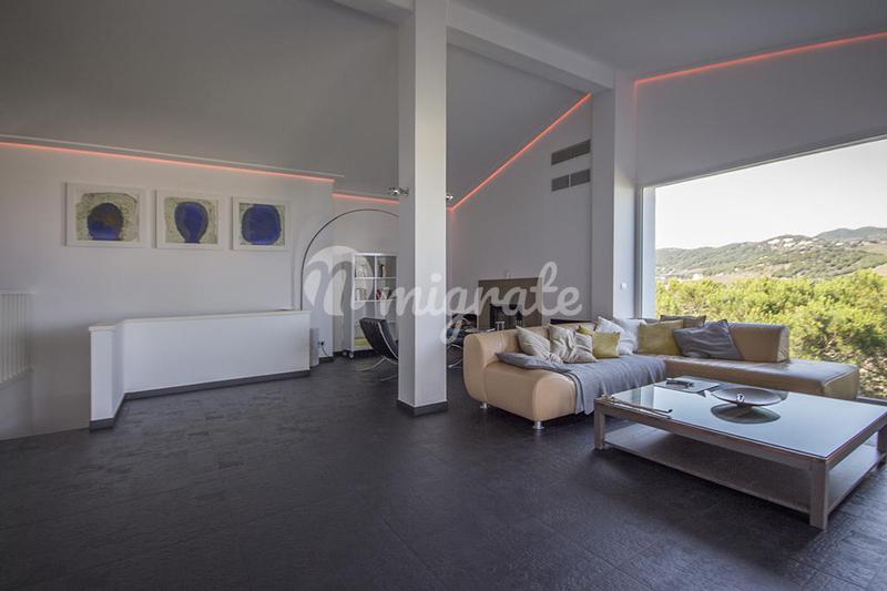 Современная вилла в средиземноморском стиле расположена на склоне холма в шаговой доступности от пляжа Эс-Фигераль. С виллы открывается потрясающий вид на море. Международный аэропорт находится всего