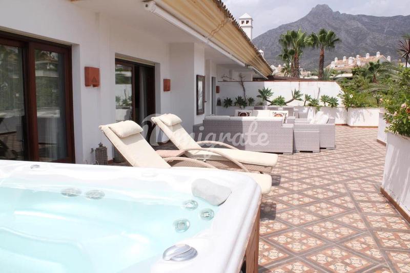 Площадь: 402 кв. м 4 спальни 4 ванные комнаты Терраса 145 кв. м. с джакузи 2 парковочных места Вид на горы В пешей доступности от пляжа, отеля Puente Romano и Marbella Club Подходит для получения ВНЖ
